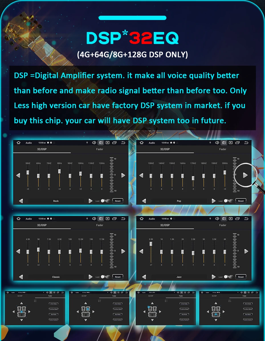 DSP (только 4G + 64G /8G + 128G имеет 32EQ)DSP = Система цифрового усилителя. Он делает звук лучше, чем раньше, и делает радиосигнал лучше, чем раньше. Только менее высокая версия автомобиля имеет заводскую систему DSP на рынке. Если вы покупаете этот чип. В будущем у вашего автомобиля будет DSP система.