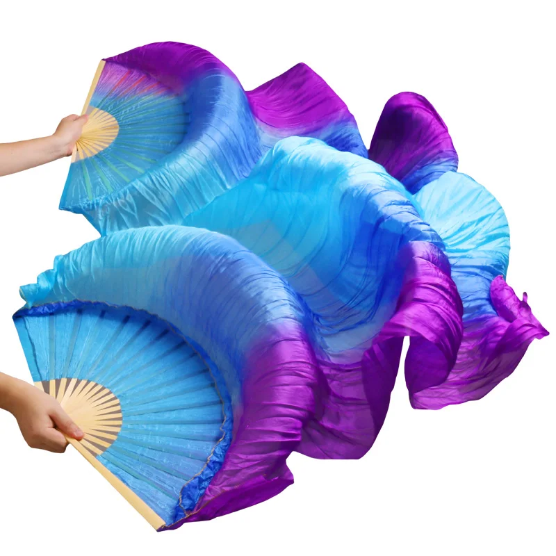 Лидер продаж, 100% шелк, 1 пара, ручная работа, высокое качество, шелк, танец живота, вентиляторы, вертикальные полосы, фиолетовый + королевский синий + бирюзовый, 180*90 смЦена указана за 1 пару/2 шт.: 1 пара = 1 левая рука + 1 правая рука