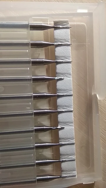 пришло быстро. "пятёрочка"-это же не почта России хуле. на удивление одна фреза сломана,и это в такой-то упаковке!!! другую фрезу сломал через 10 мм снятия меди на текстолите,думаю это я с неопытности неправильно выбрал скорость реза. больше не пробовал...