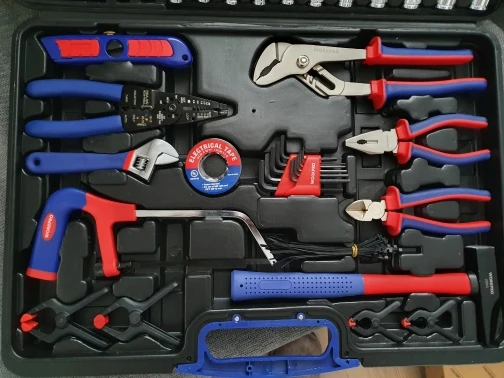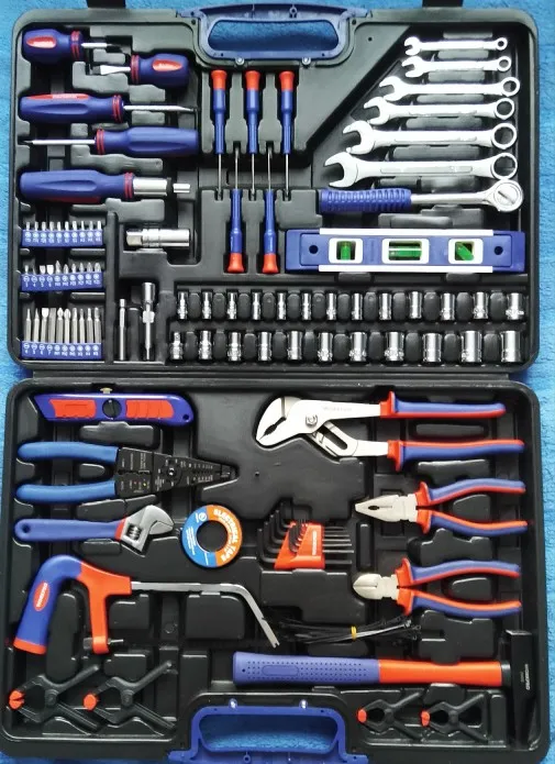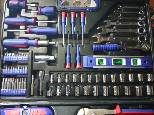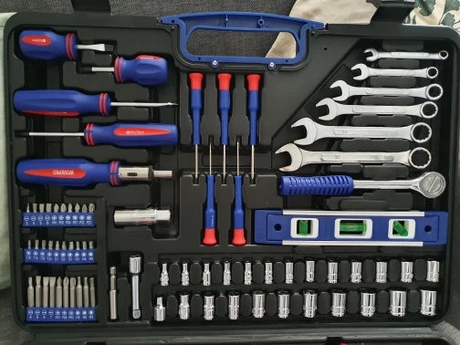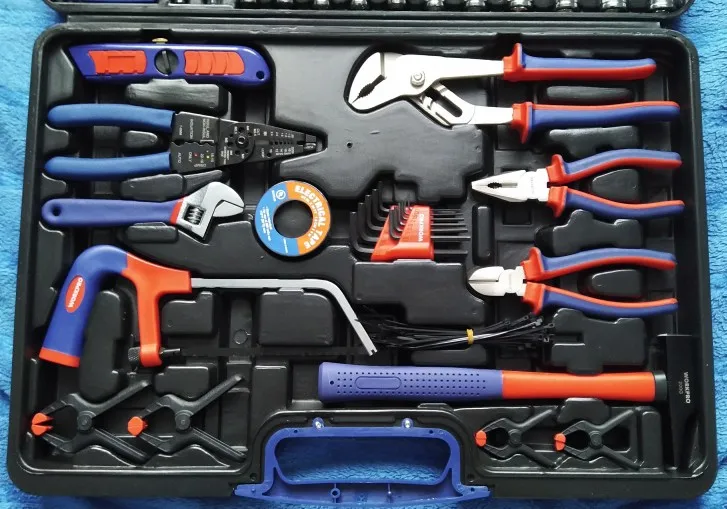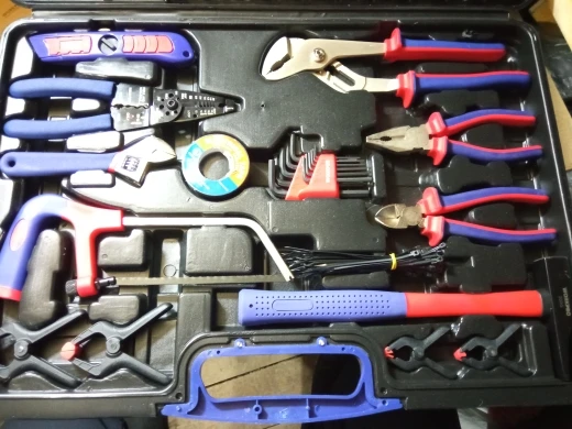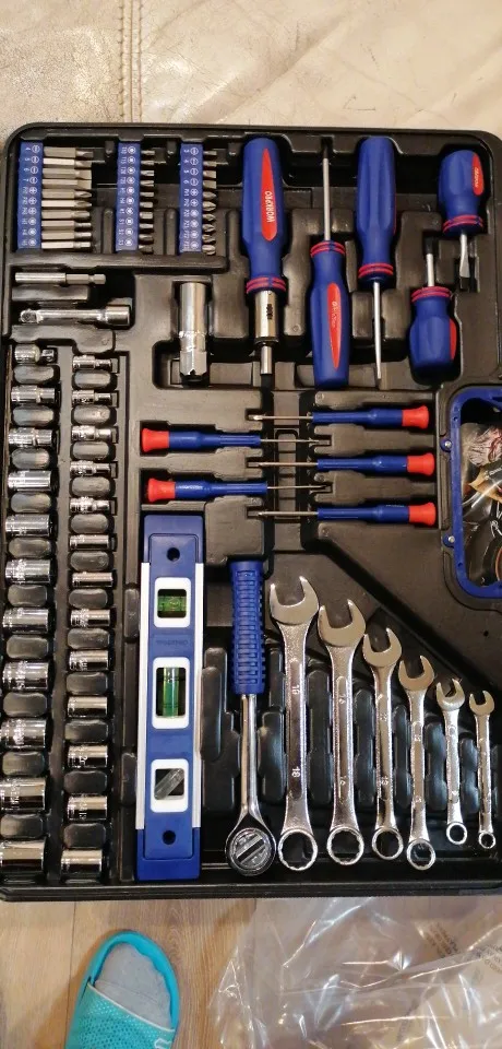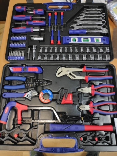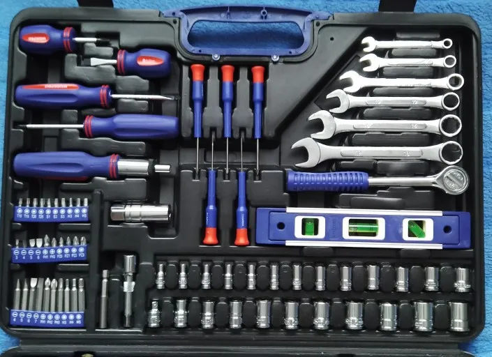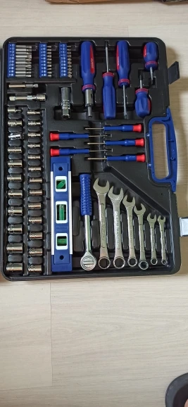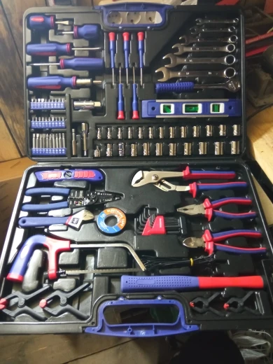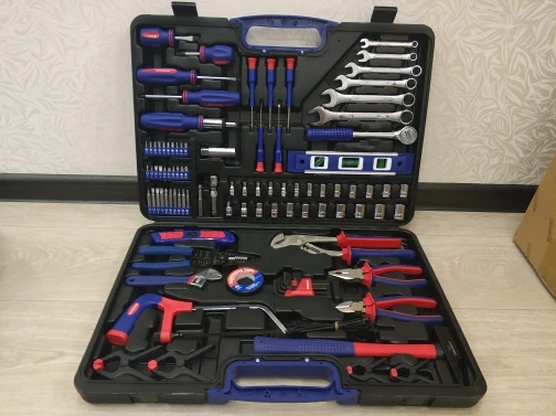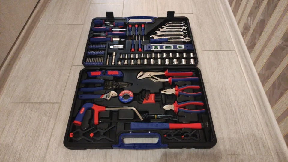 Хороший набор для дома. 99 предметов + 40 стяжек. Есть ненужные элементы, вроде пилки или ножа. Есть хорошие, клещи, трещотка... Для дома набор полезный. Чемодан крепкий, но некоторые инструменты в своих местах плохо держатся. Закрывашки пластиковые. 11.11 цена была 1800 рублей, считай даром. Отправка, доставка... дней 10 после заказа заняла.