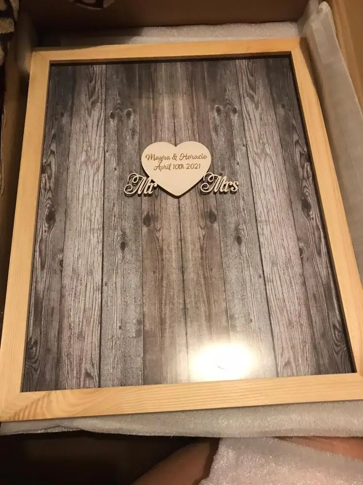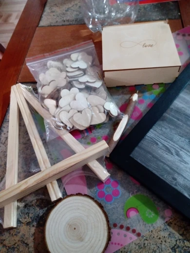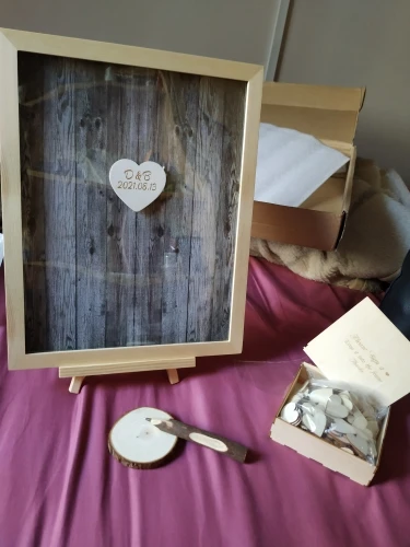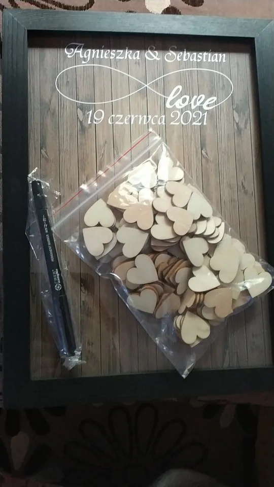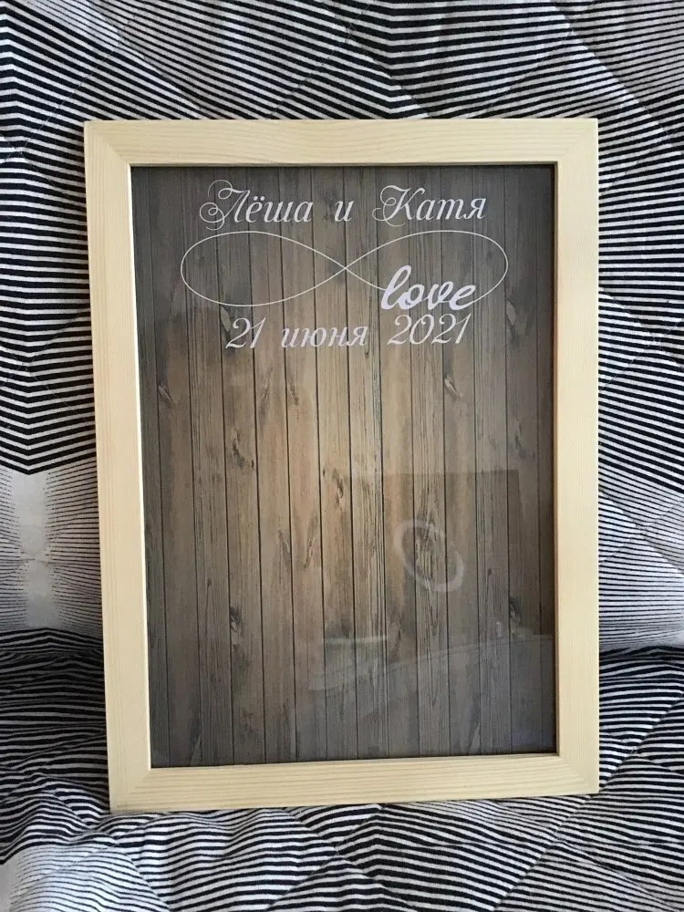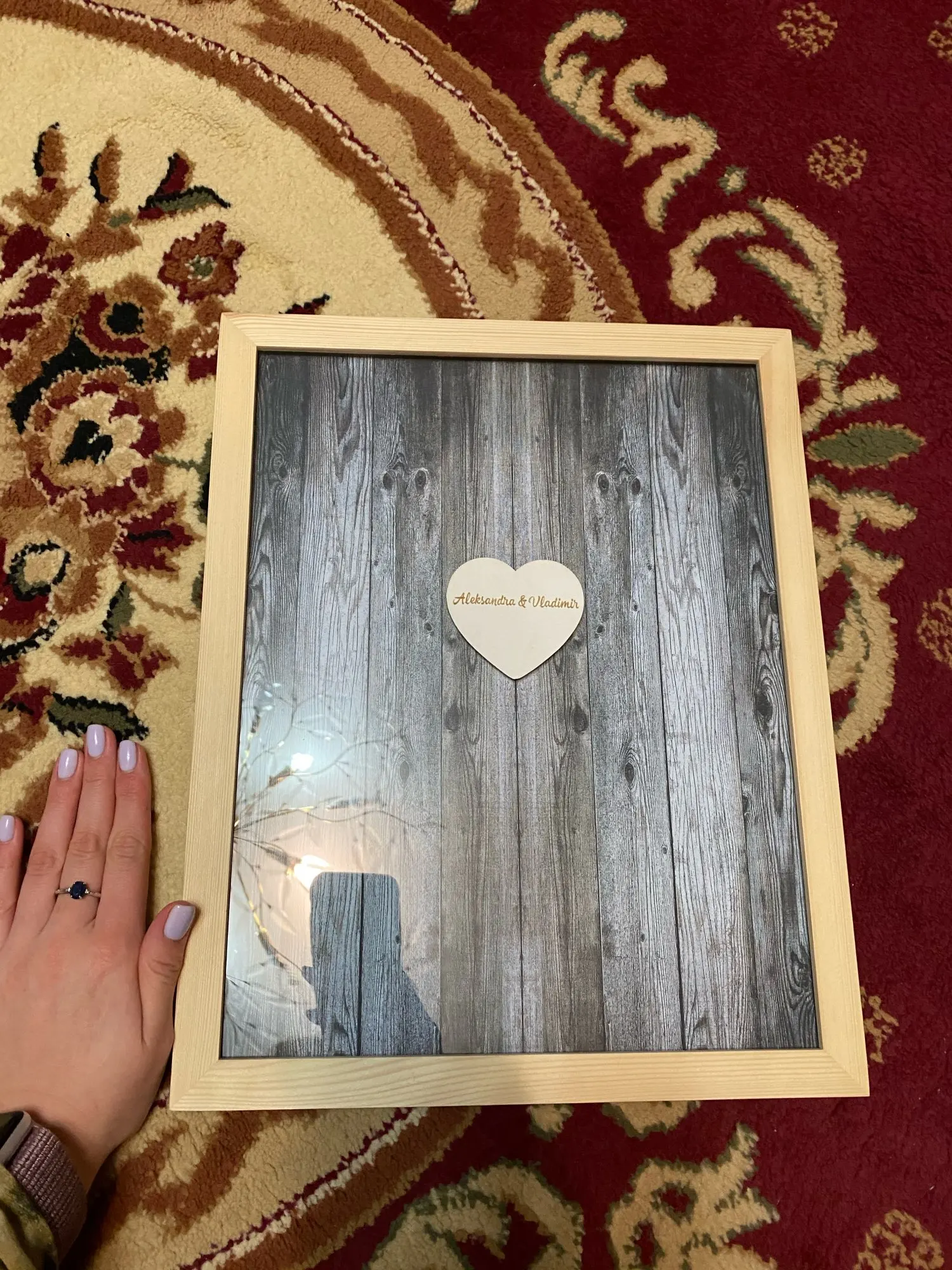 Огромное спасибо продавцу, который несмотря на мою ошибку, и то что товар уже был в печати, согласился исправить все за бесплатно и отправил правильный вариант. Дошло в течении месяца, правда без деревянной коробки для сердец и держателя. Связалась с продавцом, он сказал что в комплект с маленьким размером рамки эти элементы не входят. Не страшно. Рекомендую
