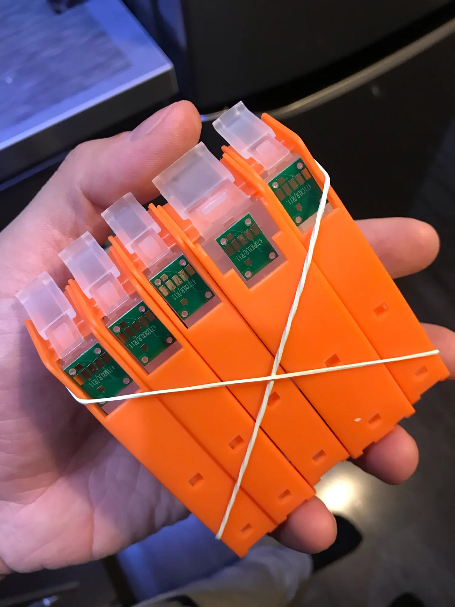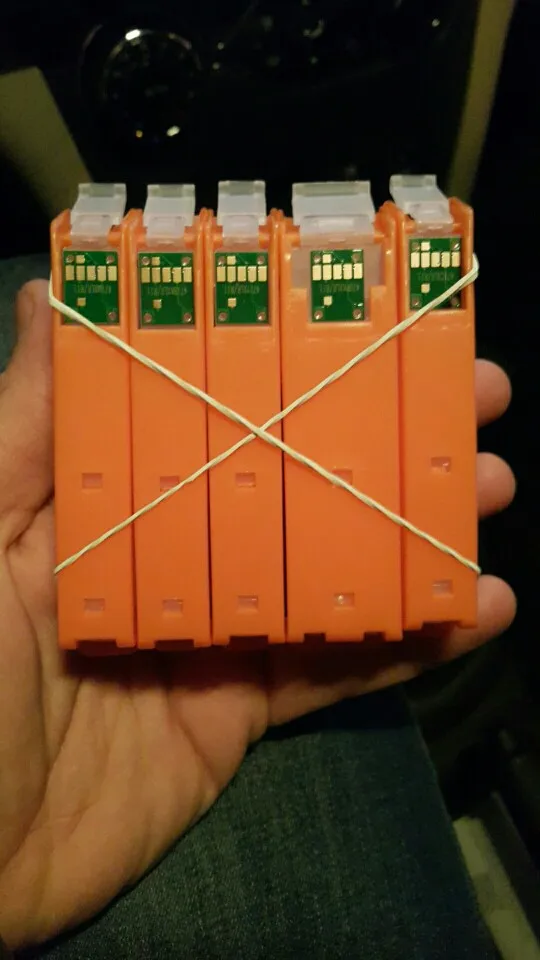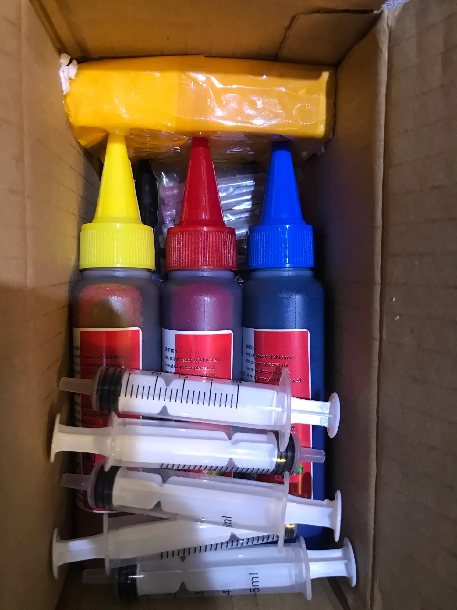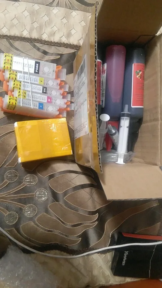 Не быстро, но все дошло. Одевайте перчатки,и снимайте наклейки с картриджей при заправке обязательно Не заливайте картриджи до конца, лучше процентов на 70, иначе при снятии защитных оранжевых заглушек будет просачиваться краска.