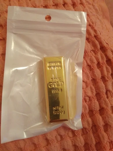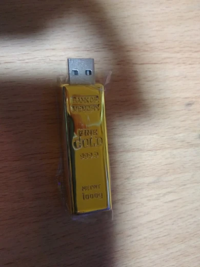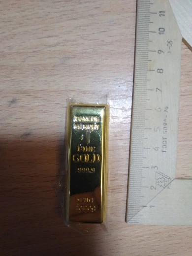 Заказывал на 32 Гб.По размеру оказалась больше,чем ожидал,что приятно удивило.Флешку приятно держать в руках-она и вправду похожа на слиток золота.Прикольная дизайнерская флешка. Реальный объем 29,2 Гб.Доставка до Пензы за месяц. Упакована хорошо.Отлично подойдёт для подарка.