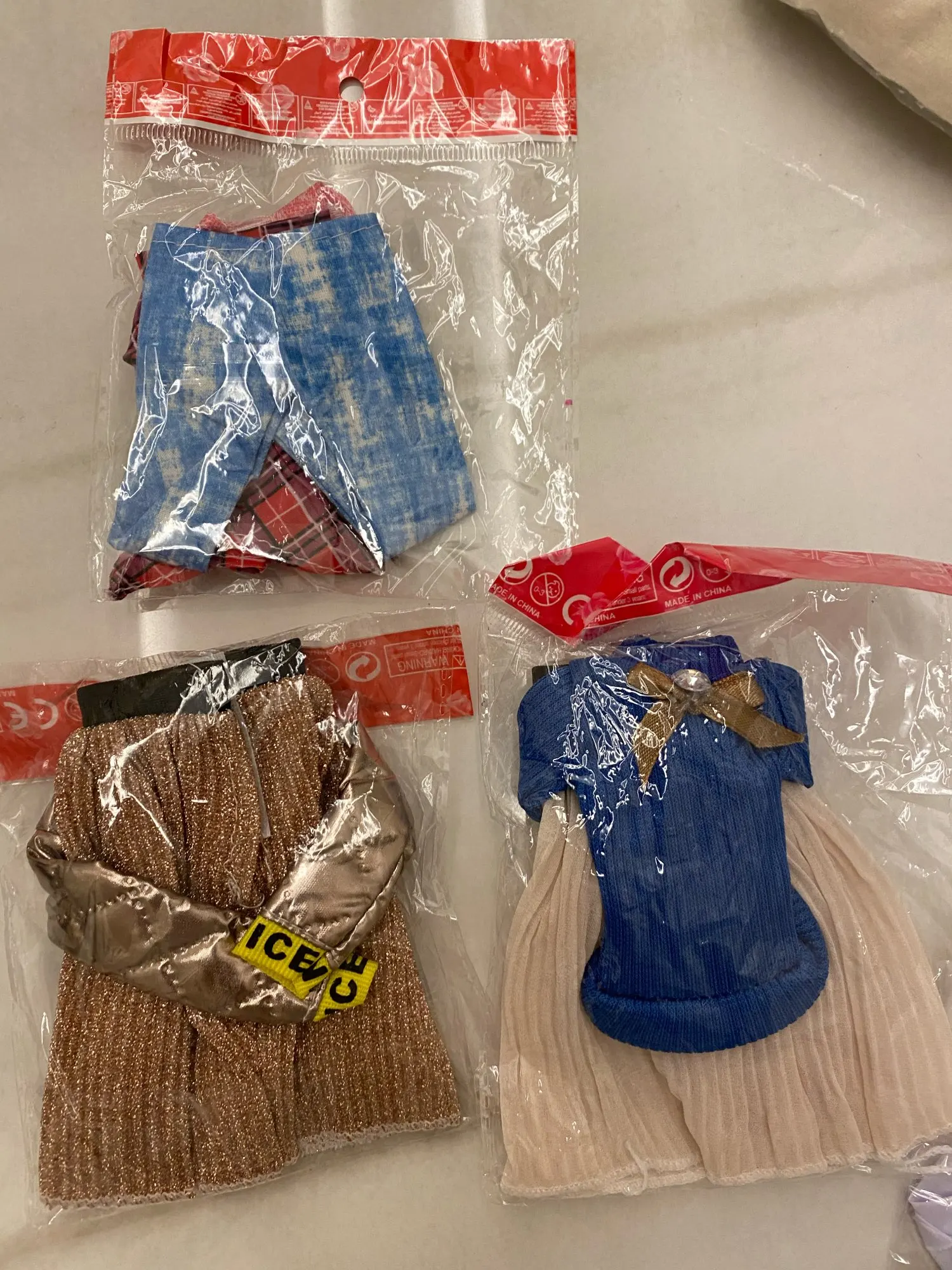 Одежда просто класс!!!аккуратно сшита,сидит отлично)))только костюм с белыми брюками,штаны маловаты для барби футболистки)))рекомендую товар и продавца!упаковано хорошо,каждый костюмчики отдельно в пакетик:))