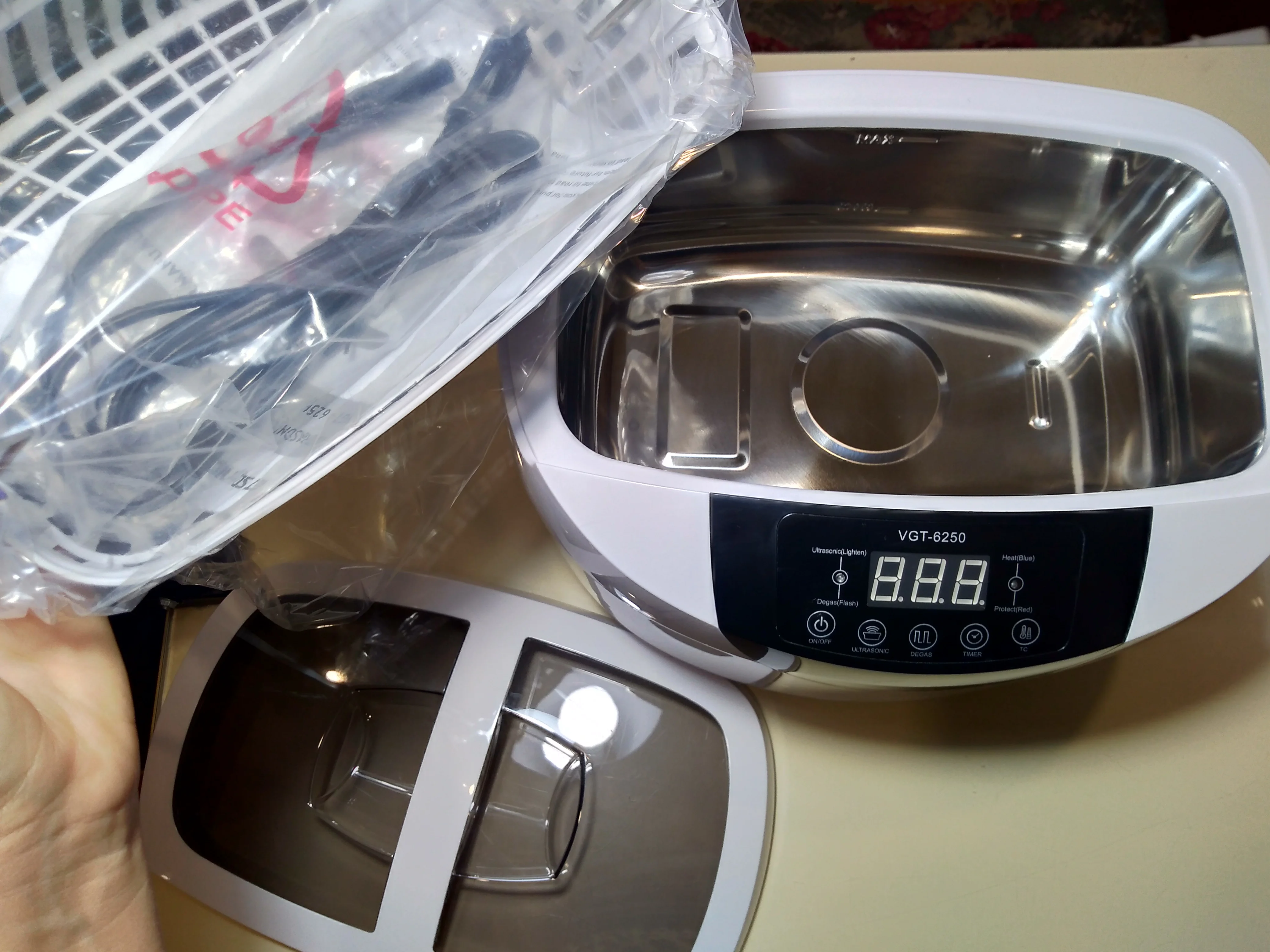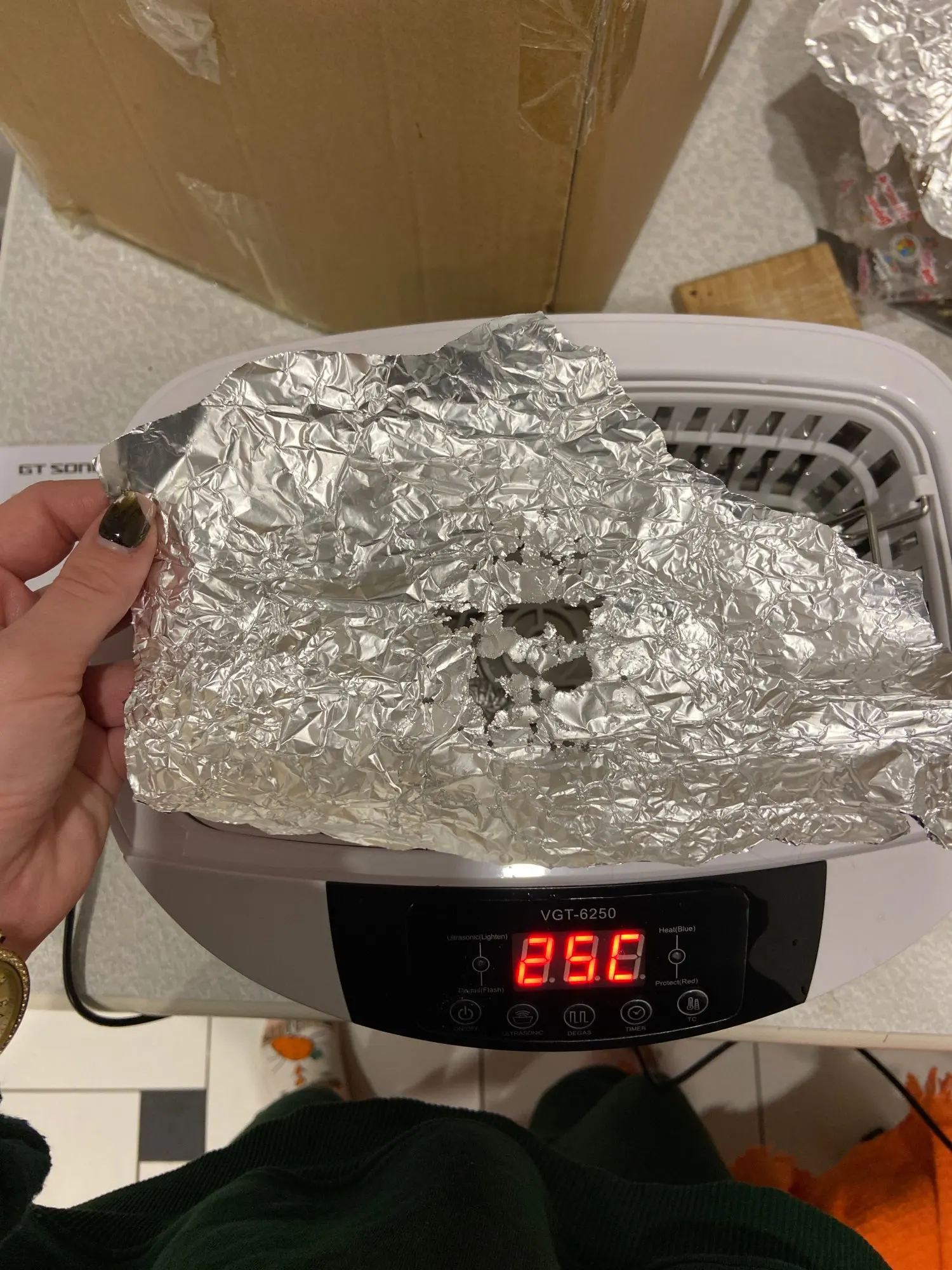 Мойка отличная ! Чистит на ура . На фото фольга разорванная за минуту . Брала для чистки инструментов для ногтей . Алмазные фрезы чистит хорошо (на два полных курса). Вода подогревается как и указано. Покупкой довольна . Продавец отвечает быстро . Общительный . Все вопросы решил.