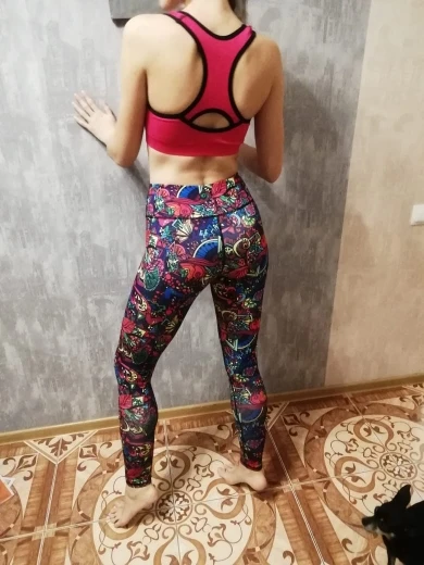 заказ пришел быстро. все как на картинке. заниматься удобно. на российский размер 40-42 взяла M. сел отлично. ничего нигде не давит. обхват груди 86-88. длинноваты штаны.
