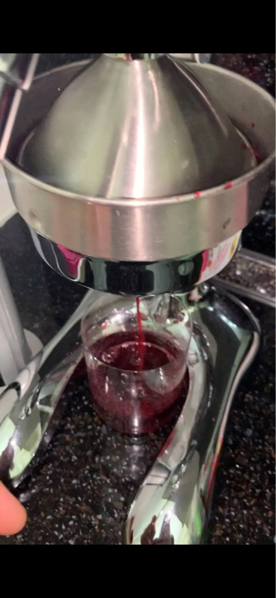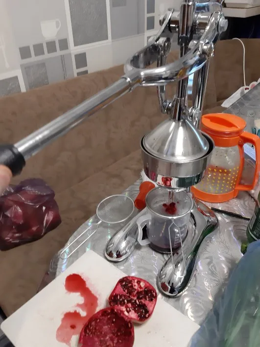 Нормальная давилка! Гранаты в целом жмёт, но по краям не дожимает, остаётся часть зёрен! Это связанно с геометрией перфорированной и ответной чаш, они пирамидальной формы! Было бы лучше, если бы они были округлые! Если не придираться пойдет! Можно накрайняк положить уже выдавленную кожуру поверх новой, тогда дожимает!