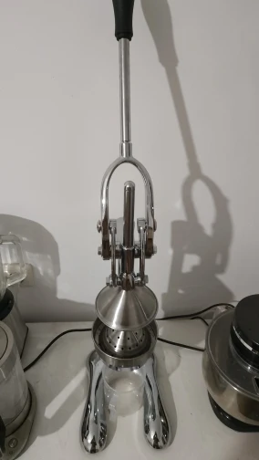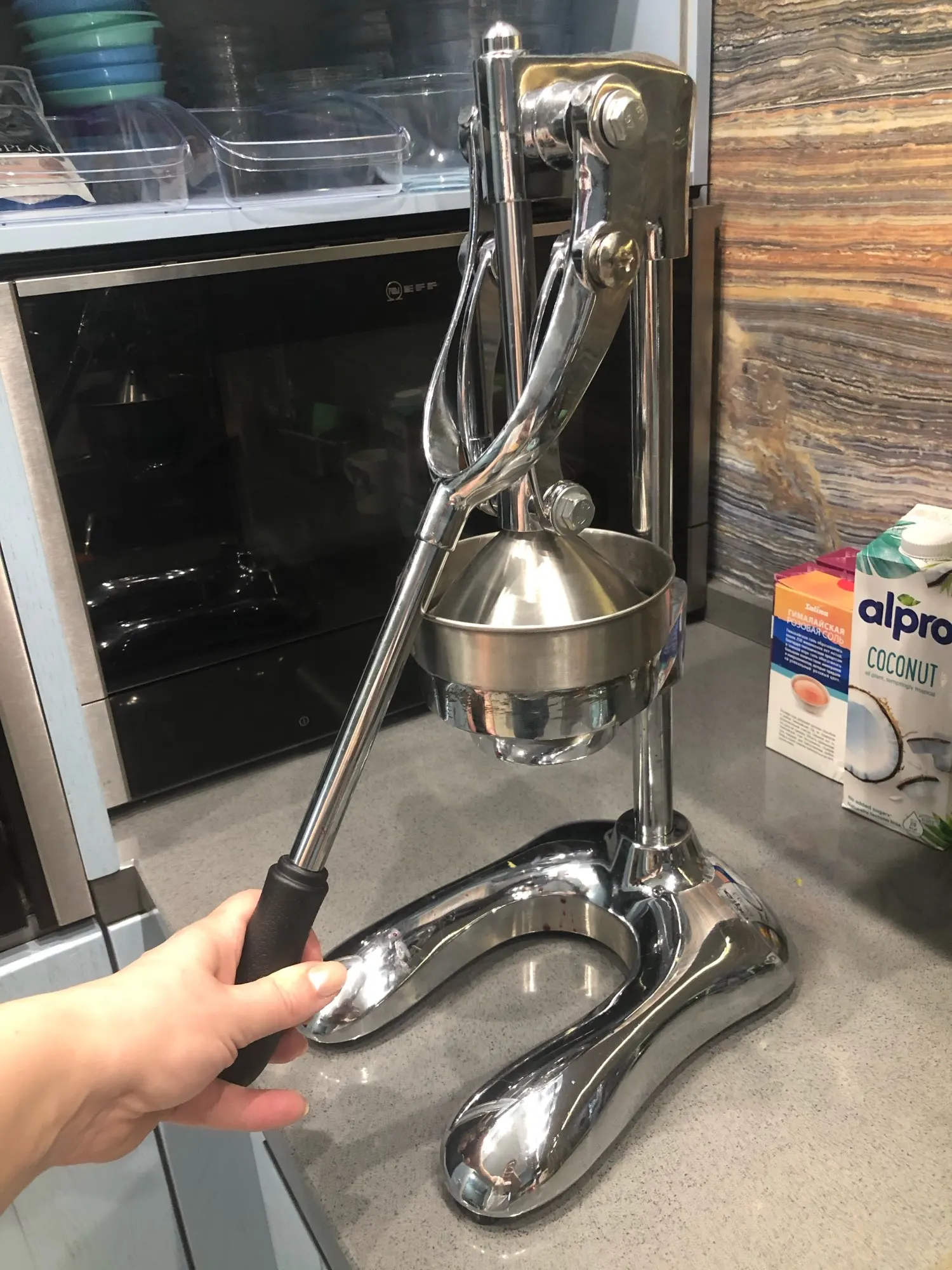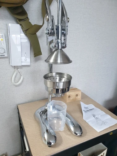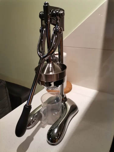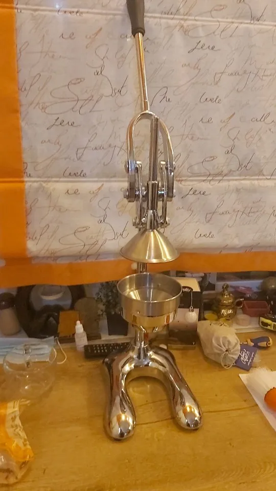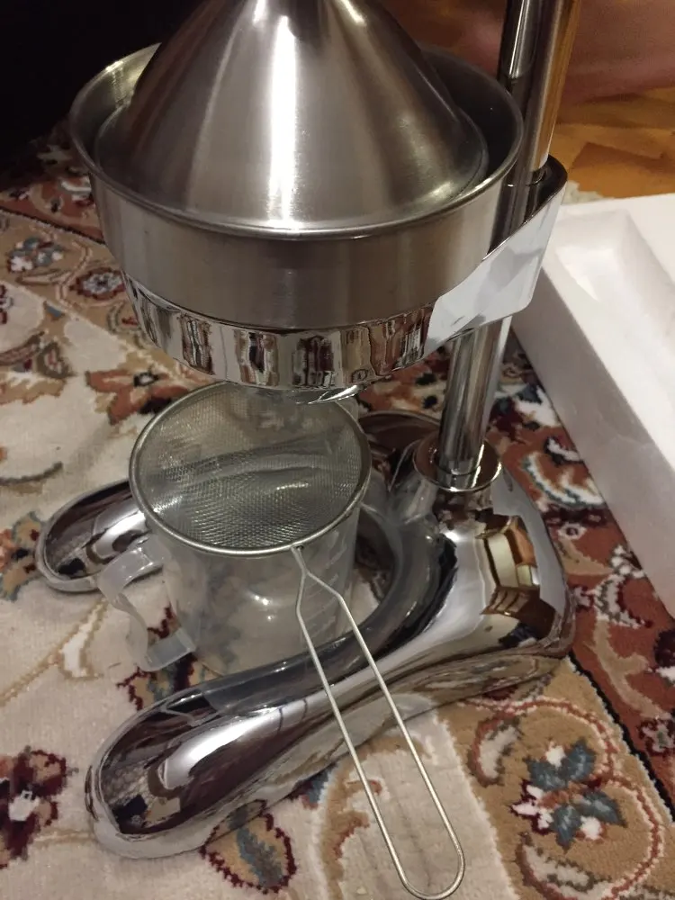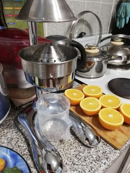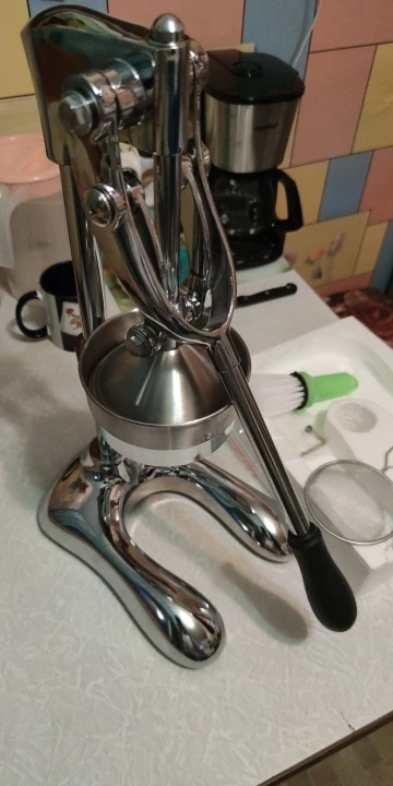 Что могу сказать... Очень быстрая доставка (4 дня), качественная упаковка и полностью целый товар (включая все комплектующие). Выглядит как агрегат, созданный в СССР: тяжеленький, крупный, "топорный" механизм в сочетании с толстой металлической основой. Надеюсь, что и по надёжности не уступит старым устройствам! Апельсины давит хорошо (не идеально). Думаю, что с лимонами та же картина. Позже попробую и гранаты.. Продавца рекомендую! Но готовьтесь выделить достаточное количество пространства на кухне: действительно крупный агрегат!