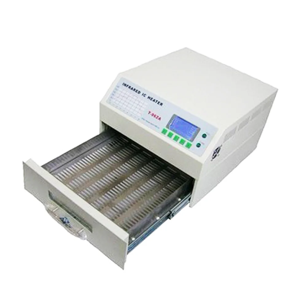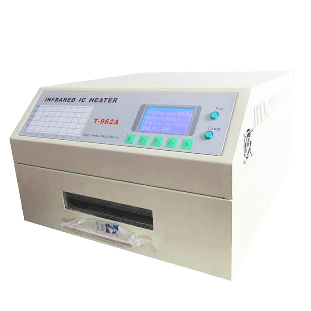 Инфракрасный IC НАГРЕВАТЕЛЬ T962A является микропроцессором, контролируемым оплавлением печи. Он используется для эффективной пайки различных SMD и BGA компонентов. Весь процесс пайки может быть завершен автоматически, и он очень прост в использовании. В этой машине используется Мощное инфракрасное излучение и циркуляция потока горячего воздуха, поэтому температура остается очень точной и равномерно распределена.