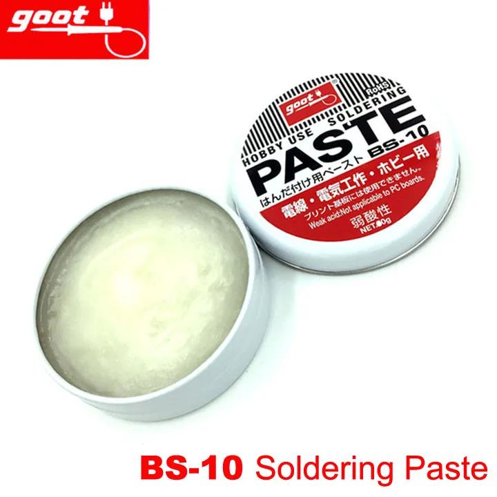 GOOTИзвестный бренд в Японии.Основной эффект паяльной пасты BS-10:Эффект инфильтрации, удаление оксида, дополнительная теплопроводность, снижение натяжения поверхности металла, придает красивый внешний вид паяным соединениямИ так далее.