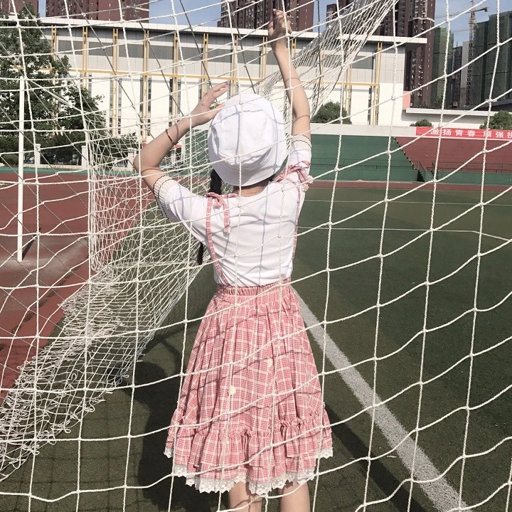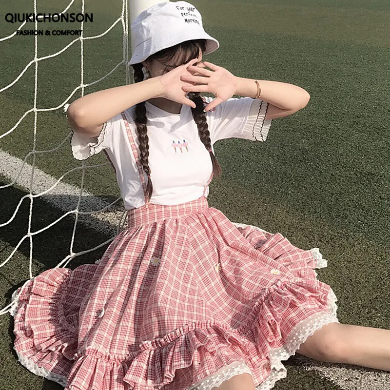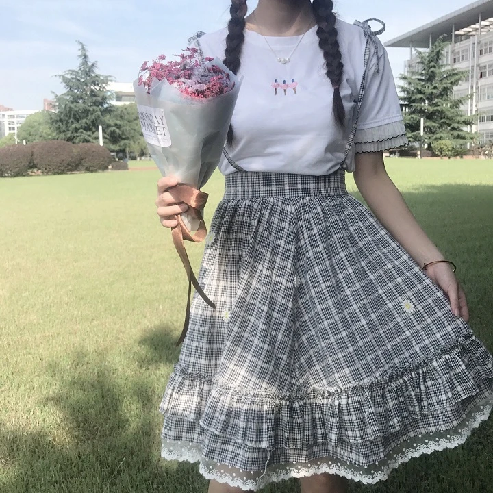 Милая юбка в стиле Лолиты, японская, мягкая, для девочек-подростков, комбинезон с аппликацией маргариток, кружевная, Лоскутная, сарафан в клетку, юбки