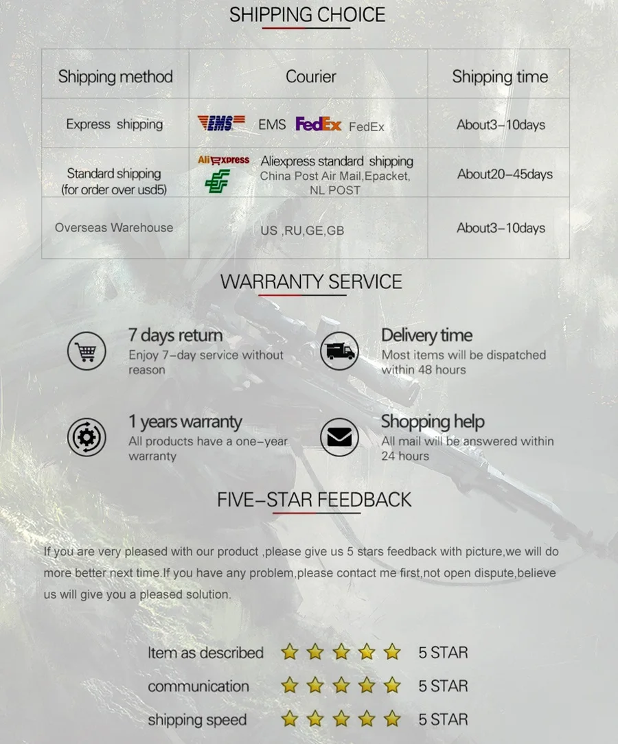 2 дня доставка в Москву курьером СДЕК доставили до квартиры. заказывал с оптикой, два заказа обьеденили- это радует, когда комплект приходит в сборе. Спасибо Огромное Продавцу! Товары Рекомендую покупать сразу в комплекте. Покупал на HATSAN-125TH с газовой пружиной (супер магнум) . Как пристреляюсь допишу отзыв.