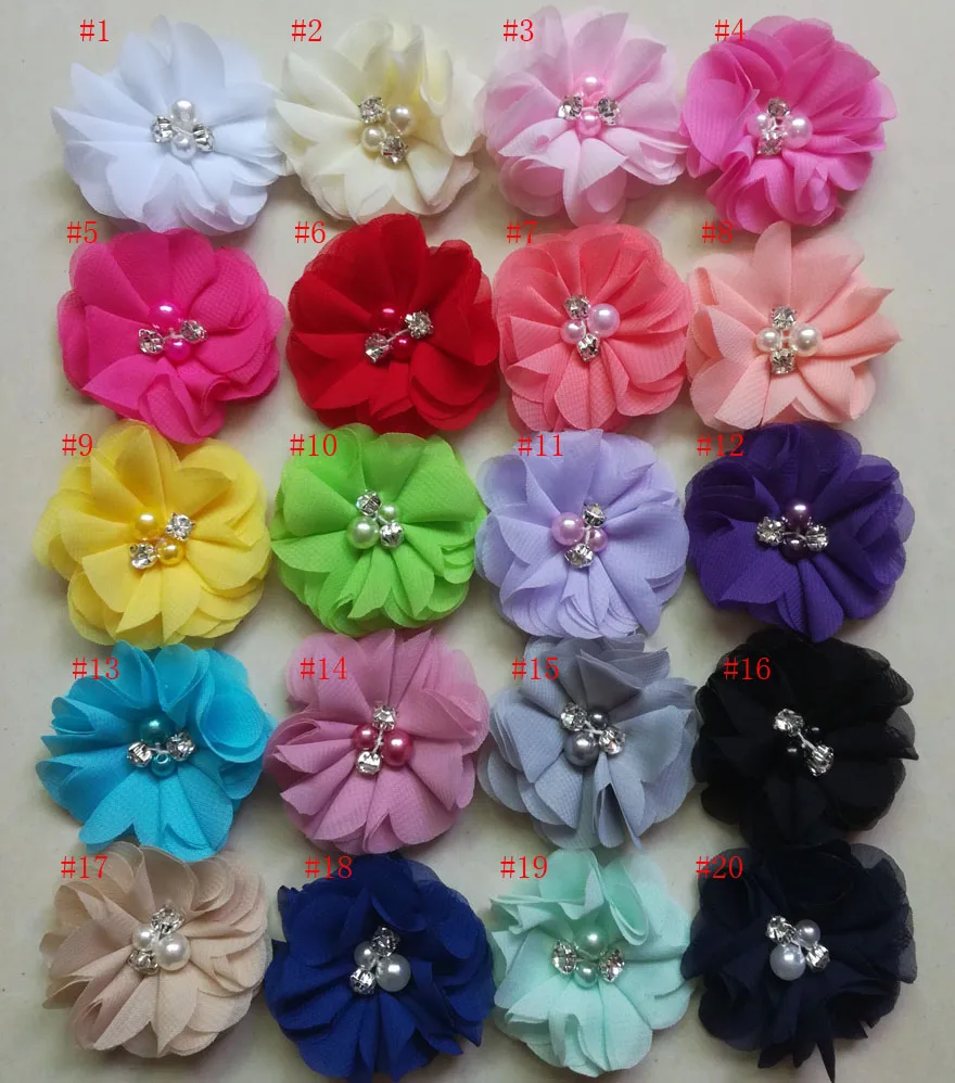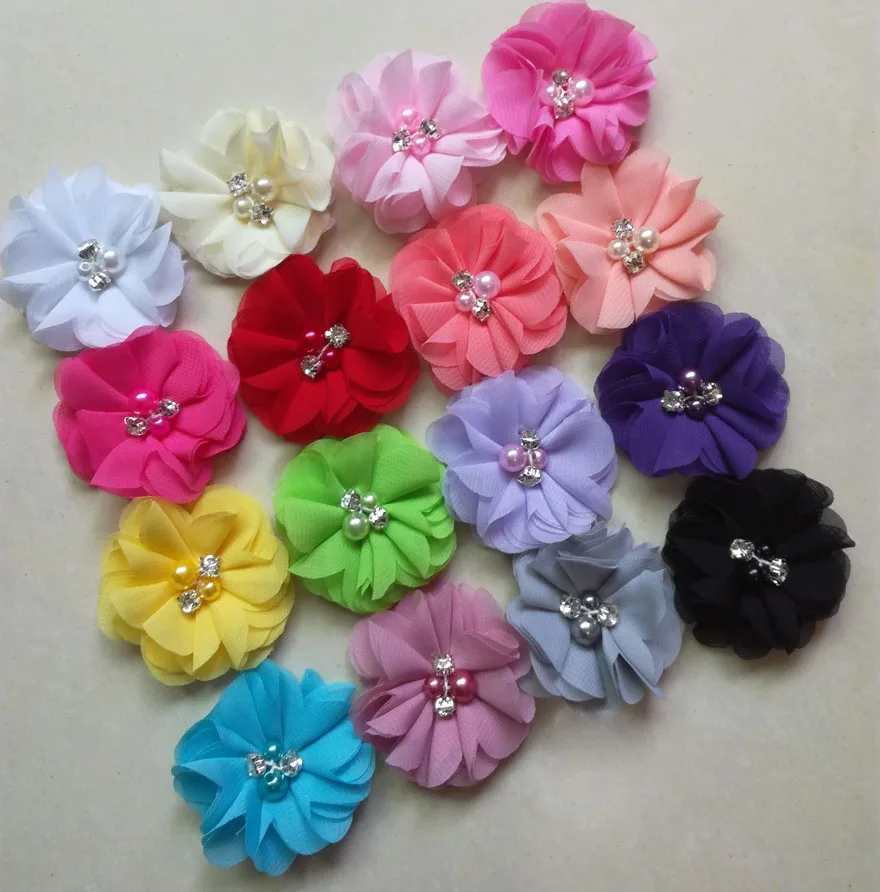 Оптовая продажа, 2-дюймовый Шифоновый Цветок с жемчужным центром для девочек, детская повязка на голову, Шифоновый Цветок из бисера для украшения