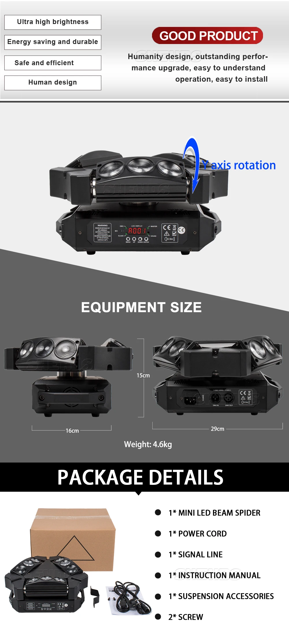 * Режимы работы: DMX512, автоматический запуск, звуковое действие, стробоскоп, автономный и мастер/раб, с богатой усовершенствованной встроенной программой