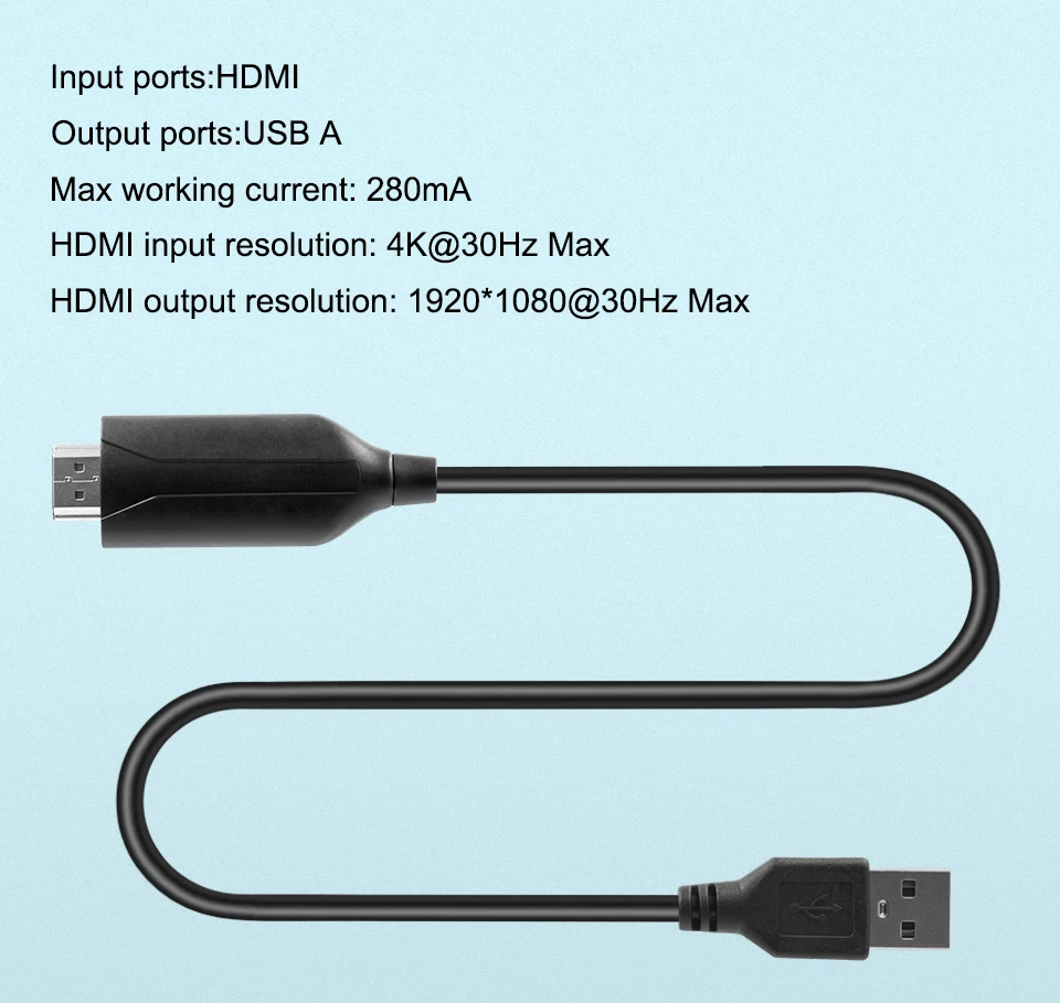 * Поддержка входного максимального разрешения 3840x2160 @ 30 Гц;* Поддержка вывода Максимальное разрешение 1920x1080 @ 30 Гц;* Поддержка 8/10/12bit глубокий голубой цвет;* Поддерживаемый стандартный кабель HDMI 26: вход до 15 метров,(Разрешение 1080P и ниже);* Поддержка большинства программ для приобретения, таких как VLC< OBS. Amcap и т. Д. * Поддержка Windows и MacOS;* Соответствует стандарту USB Video и UVC;* Соответствует стандарту USB Audio UAC;* Без внешнего источника питания, компактный и портативный.Содержимое HDCP (устройства, совместимые с шифрованием HDMI) не допускается для захвата.