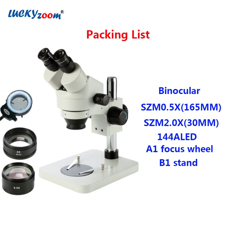 One Binocular Stereo Zoom Head One Pair of SUPER Widefield 10X Eyepieces One SZM2.0X WD30mm One SZM 0.5X WD165mm One 144pcs led light with adaptor One Pillar Table Stand One Focusing Rack One Round Plastic Plate One Pair of Eye-Guards One Pair of Clips One Dust Cover