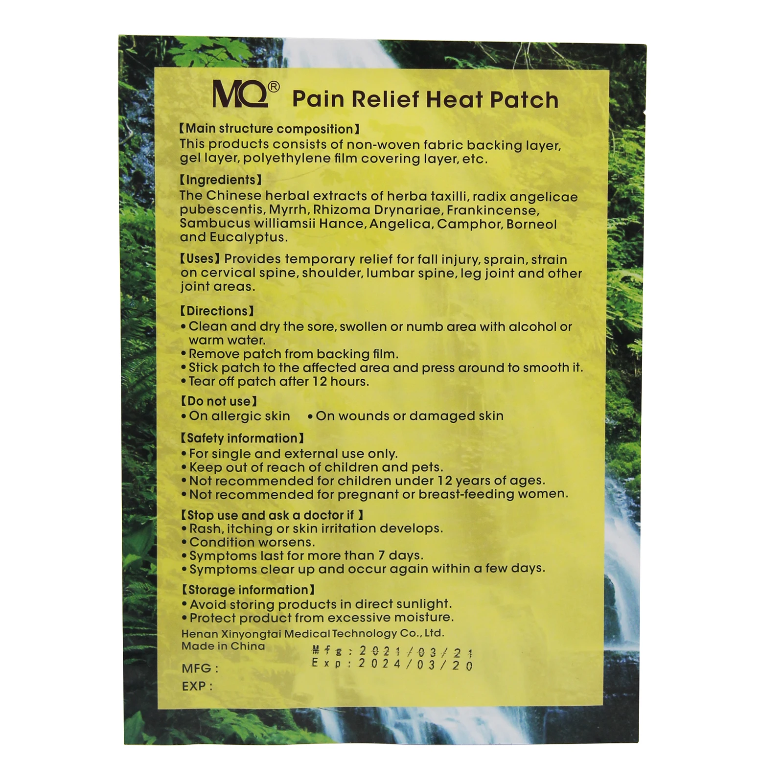 Область применения:Применимо к ветру, холоду, влаге, шее, плечу, вызванному злом талии, ног и других суставов и разнообразной болью, вызванной ушибом мягких тканей.