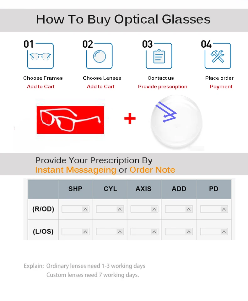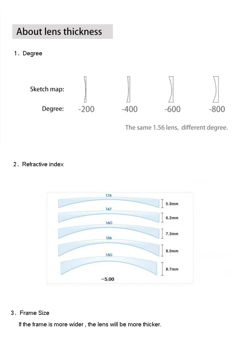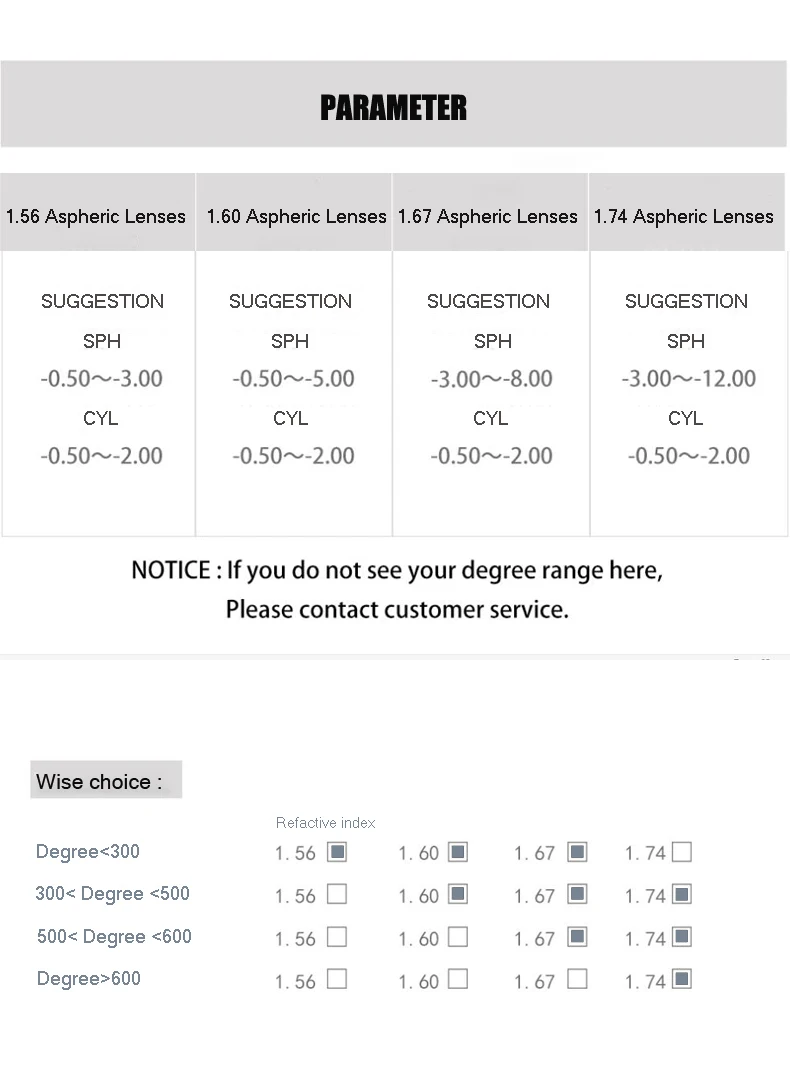 1,56 асферические линзы Рекомендуемая мощность:SPH: -0,50 ~-4,00; CYL: -0,50 ~-2,00SPH: + 0,50 ~ + 4,00; CYL:+ 0,50 ~ + 2,001,61 асферические линзы Рекомендуемая мощность:SPH: -0,50 ~-6,00; CYL: -0,50 ~-2,00SPH: + 4,00 ~ + 6,00; CYL:+ 0,50 ~ + 2,001,67 асферические линзы Рекомендуемая мощность:SPH: -1,00 ~-8,00; CYL: -0,50 ~-2,00SPH: + 4,00 ~ + 8,00; CYL:+ 0,50 ~ + 2,001,74 асферические линзы Рекомендуемая мощность:SPH: -3,00 ~-12,00; CYL: -0,50 ~-2,00SPH: + 0,50 ~ + 12,00; CYL:+ 0,50 ~ + 2,00Примечание: линзы по рецепту под одним из четырех ниже условий относятся к индивидуальным объективам, фабрика линз должна изготовить линзы специально для вас, они будут запрашивать дополнительную стоимость 10 или 20 долларов США. Спасибо за понимание!Цилиндр>-2,00 или> + 2,00 (USD10)Цилиндр>-3,75 или> + 3,75 (USD20)Вы можете оплатить дополнительные расходы здесь:USD10 : https://fr.aliexpress.com/item/4000525413931.html?spm=a2g0w.12010612.8148356.4.53fb3c85vPXOcWДобавить (+ 0,00 ~ + 3,00)Если у вашего рецепта есть дата добавления, пожалуйста, купите по этой ссылкеДобавить (+ 0,00 ~ + 3,00): https://fr.aliexpress.com/item/32664005790.html?spm=a2g0w.12010612.8148356.12.53fb3c855jfYD0Если у вас есть какие-либо вопросы, пожалуйста, свяжитесь со службой поддержки клиентов в моем магазине.