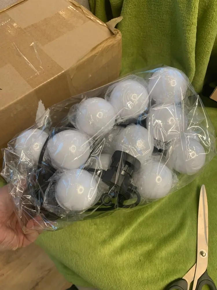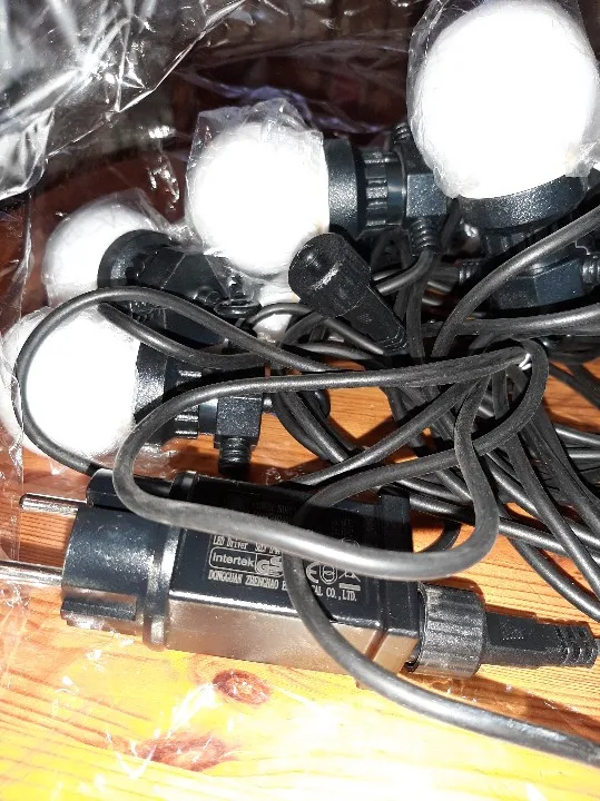 очень качественные шарики, быстрая доставка с Польши в Литву - неделя . Подходят для улицы, на каждом шарике крючек - удобно вешать, хороший толстый провод. Каждый шарик запакован отдельно. Заказывала две гирлянды. Очень рекомендую!