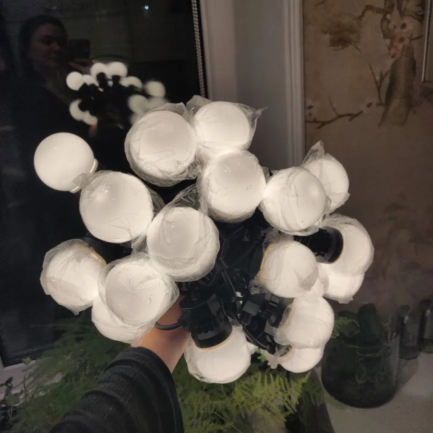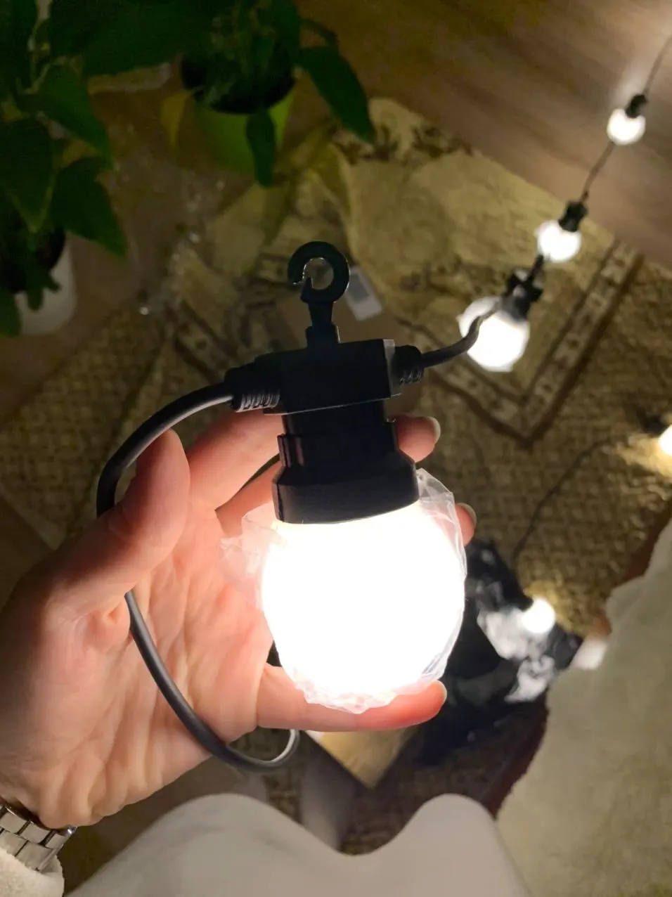 Гирлянда супер, доехала за пару дней в МО, очень приятный свет у лампочек: теплый, но не желтит, а такой приятный розоватый что ли. Мужу понравилось качество исполнения: надежный кабель и вилка