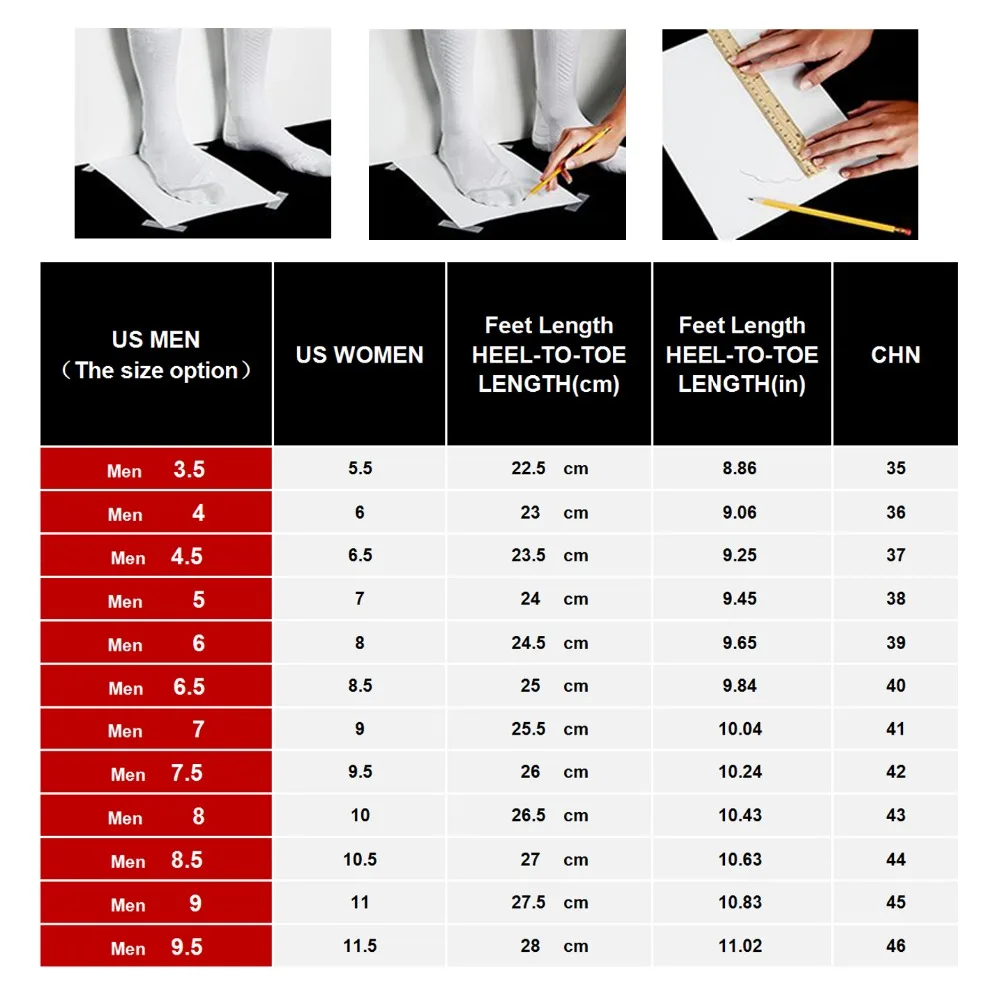 Пожалуйста, носите носки для измерения длины стопы. Пожалуйста, не забудьте выбрать правильный размер, измерив длину стопы. Шаг 1: Встаньте прямо на твердую поверхность с пяткой к стене; Шаг 2: Поместите ногу на кусок чистой бумаги, приклеенной к полу;