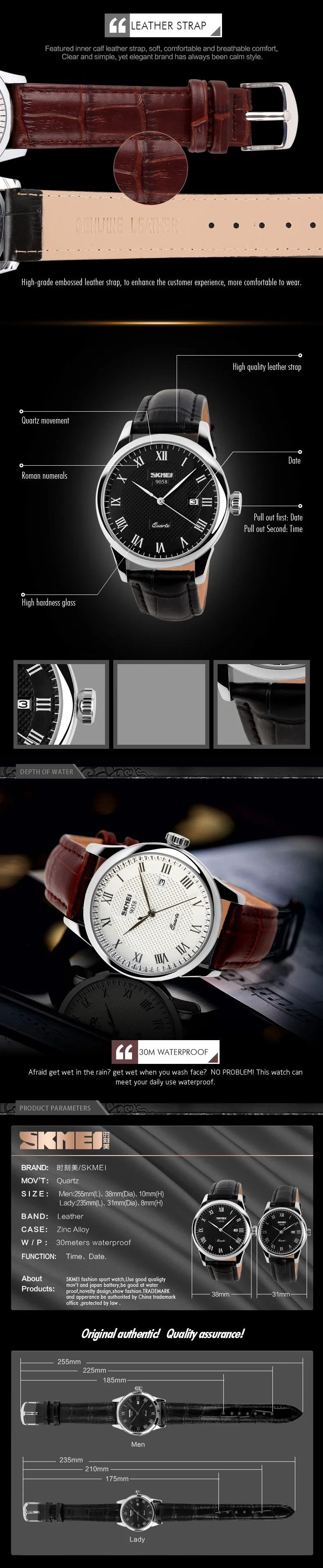 Часы наручные SKMEI мужскиеженские кварцевые, брендовые Роскошные модные повседневные водонепроницаемые с кожаным ремешком, для влюбленных, 30 м, 9058