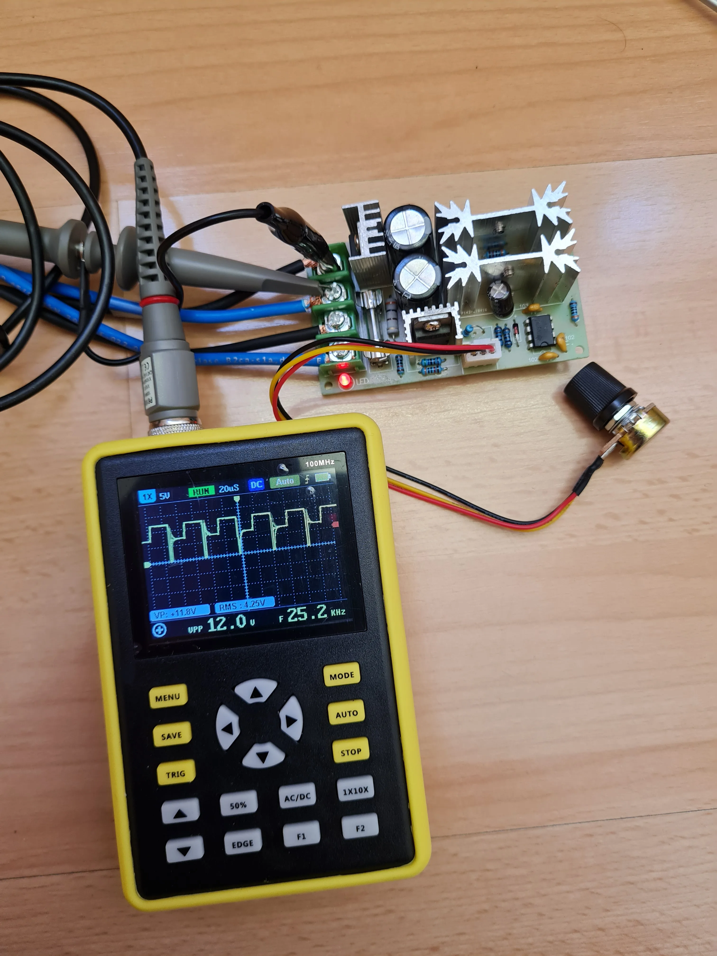 Я использую его для регулирования светодиодной ленты (12 В-8 а). Светодиодные регуляторы, которые Вы можете купить на aliexpress, имеют частоту переключения около 2 кГц, которая генерирует шумы в источнике питания. С этим регулятором эта проблема была решена, потому что частота переключения составляет 25 кГц, что выходит из аудиодиапазона человека. Кроме того, он почти не нагревается при нагрузке 8A 12 В. Я очень доволен товаром.