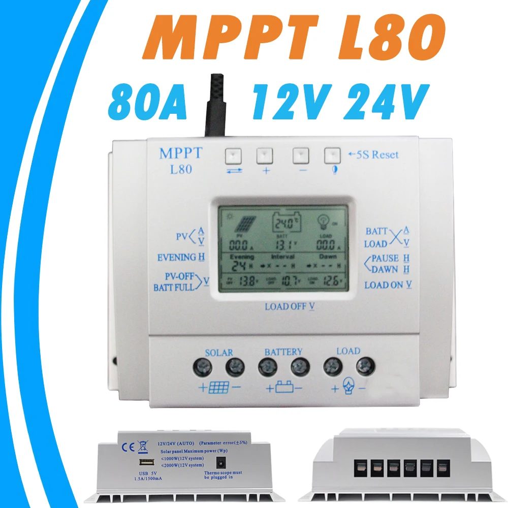 MPPT 80A контроллер солнечного зарядного устройства USB 1.5A 5V 12V 24V LCD Регулятор солнечной панели с таймером нагрузки и светильник управления для светильник ing