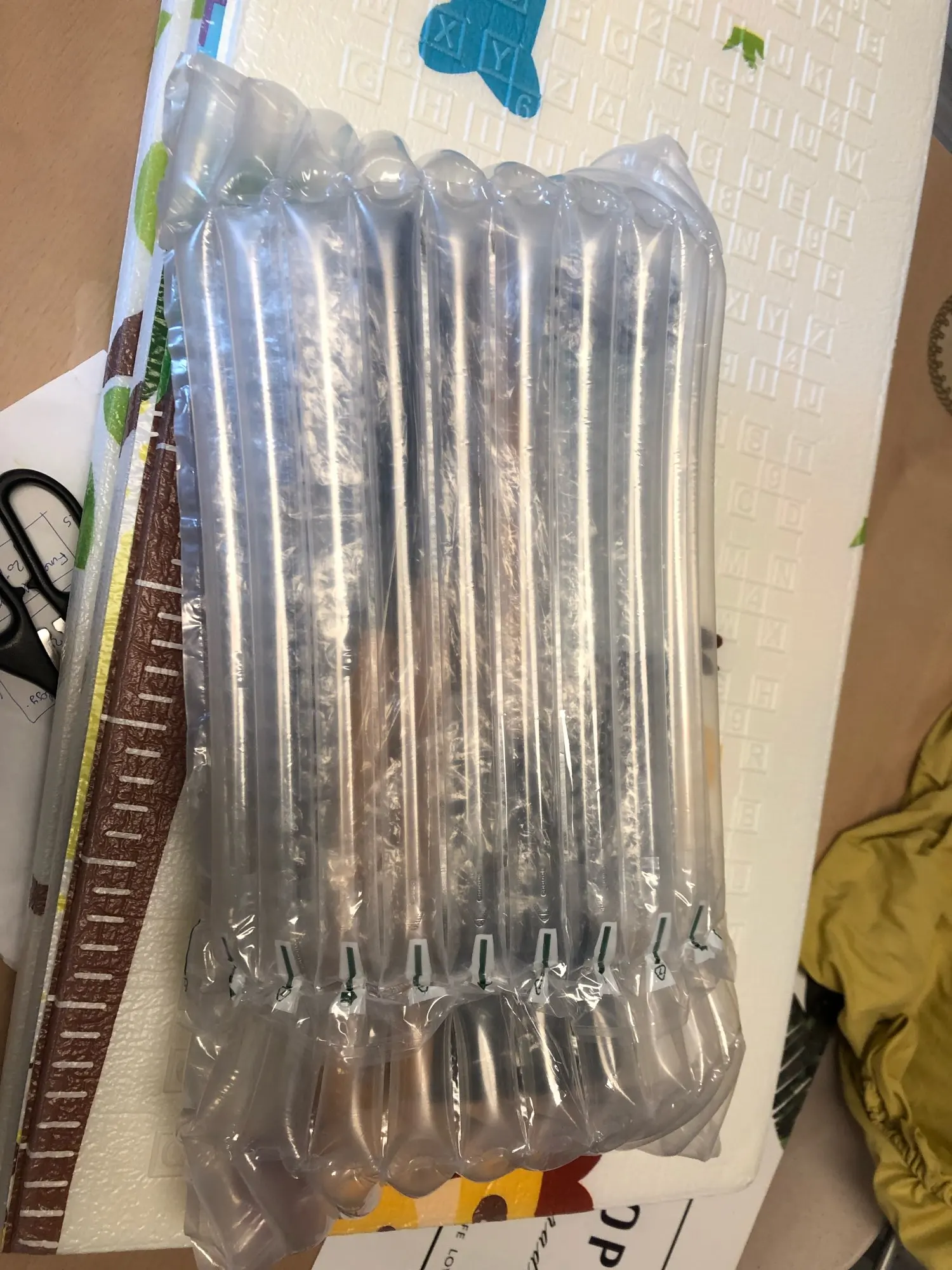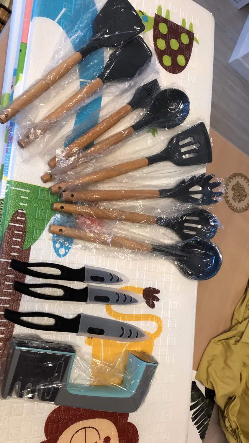 Очень крутые ножи! Упаковано было все в очень толстую пупырку, да и сами они в чехле, все очень надежно! Ручки нескользящие, в руке лежат очень удобно, красивые и немаркие, с черными лезвиями. которые не выпирают за ручки и не травмируют руки при использовании. Доставка правда была долго, но это не критично. Продавца рекомендую, надежный, товар как и заявлено очень высокого качества.
