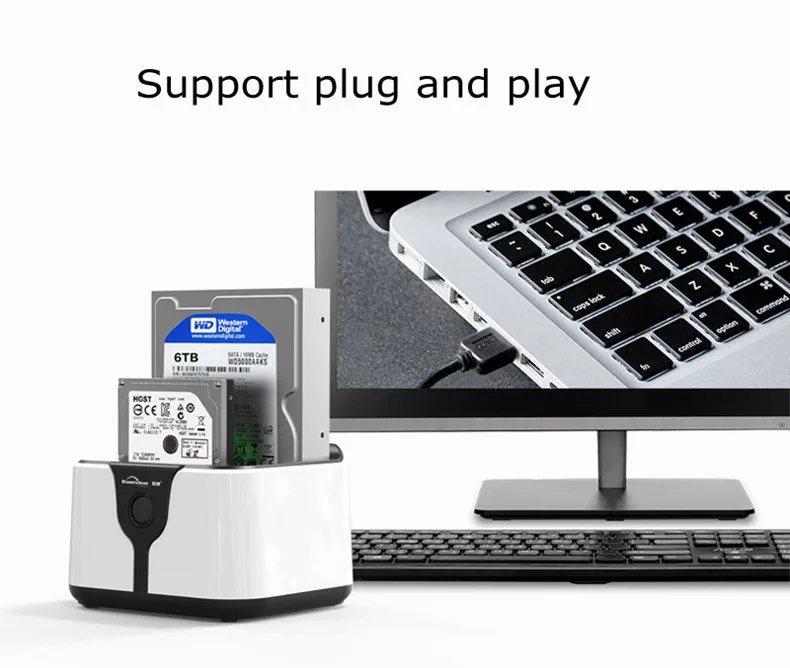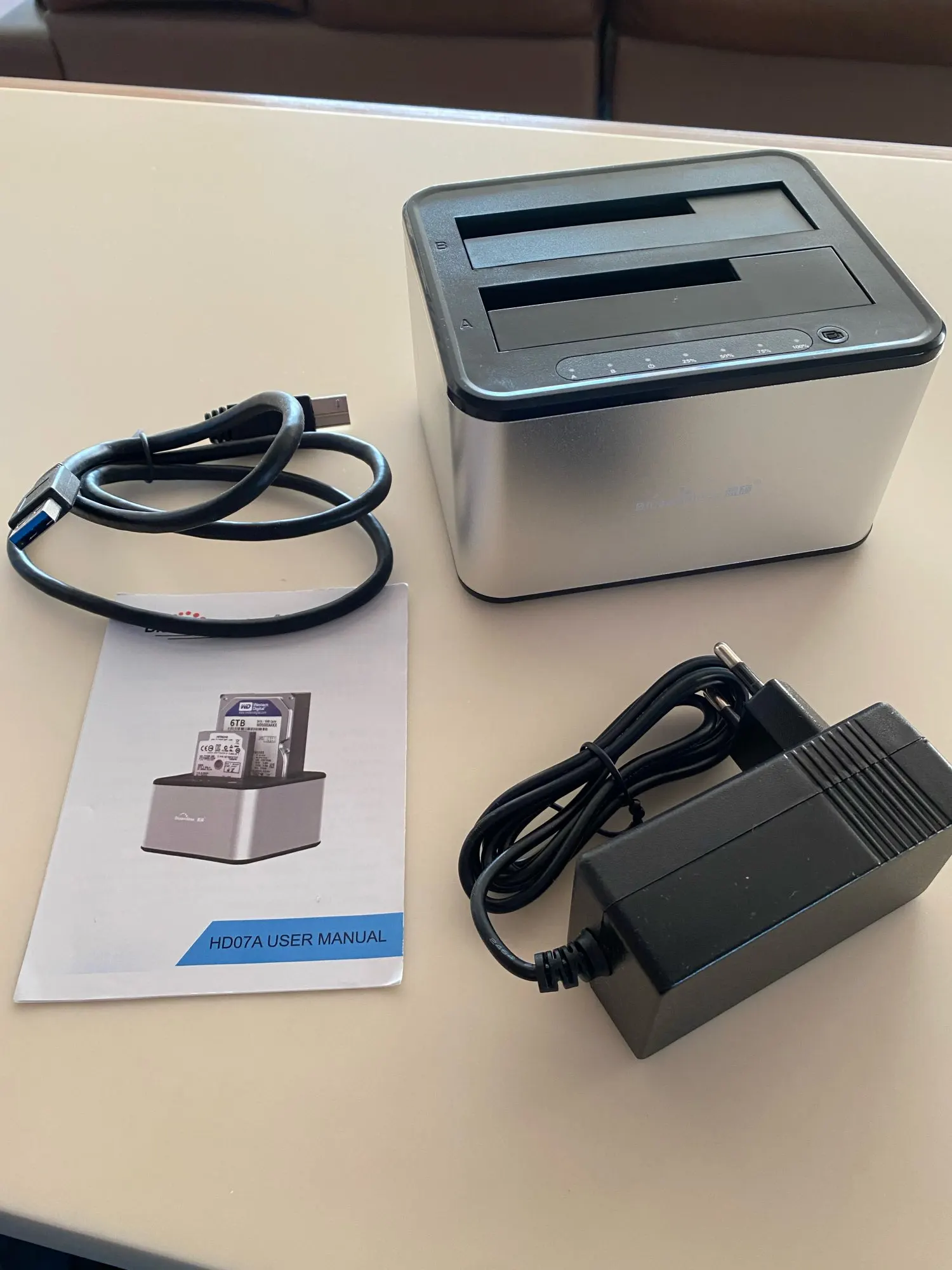Товар получен, работоспособен. комплектация на фото. Так и не понял для чего нужна кнопка спереди, так как она ни на что не реагирует. В целом выглядит хорошо. Хотя пластик мягковат. На одном из фото показана скорость копирования фильма в 2 Гб с одного жесткого диска на другой, установлены оба в док-станцию. Продавец положил пару презентов: переходник с USB на type C и классный чехол для жесткого диска 2.5. Спасибо)