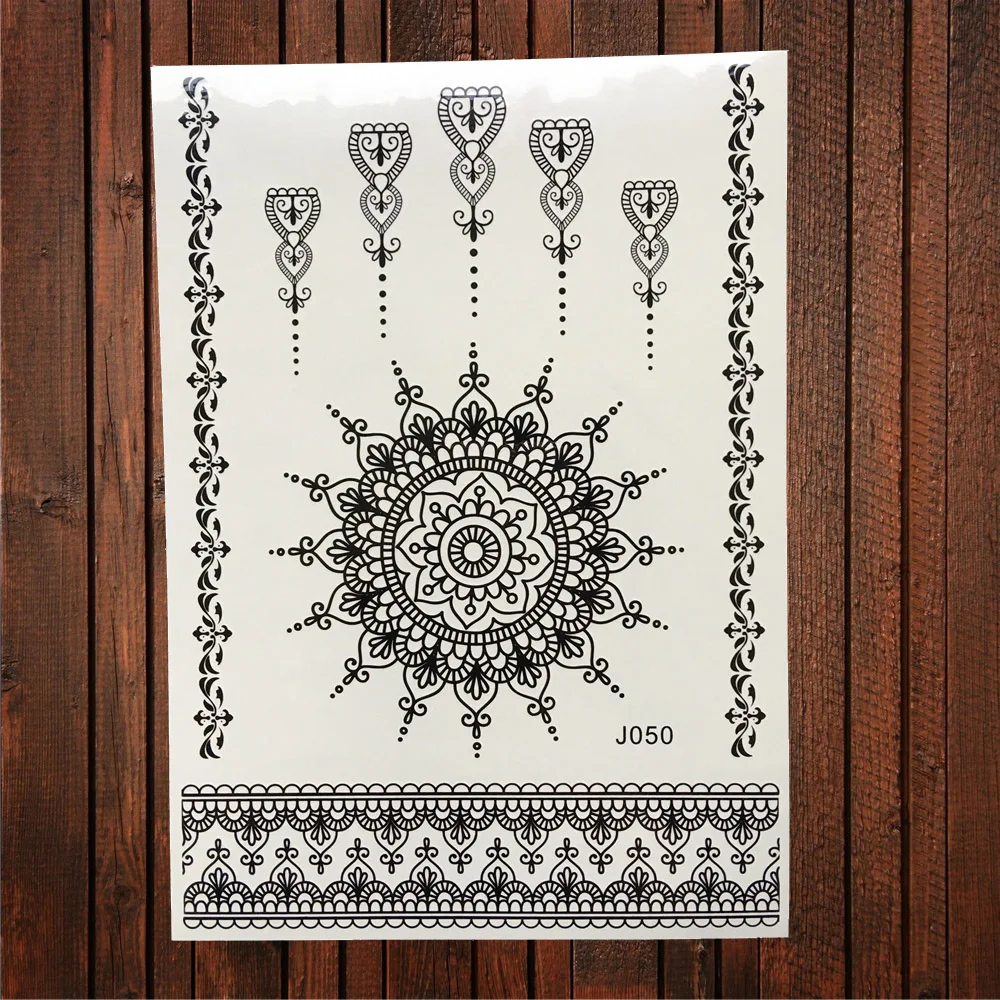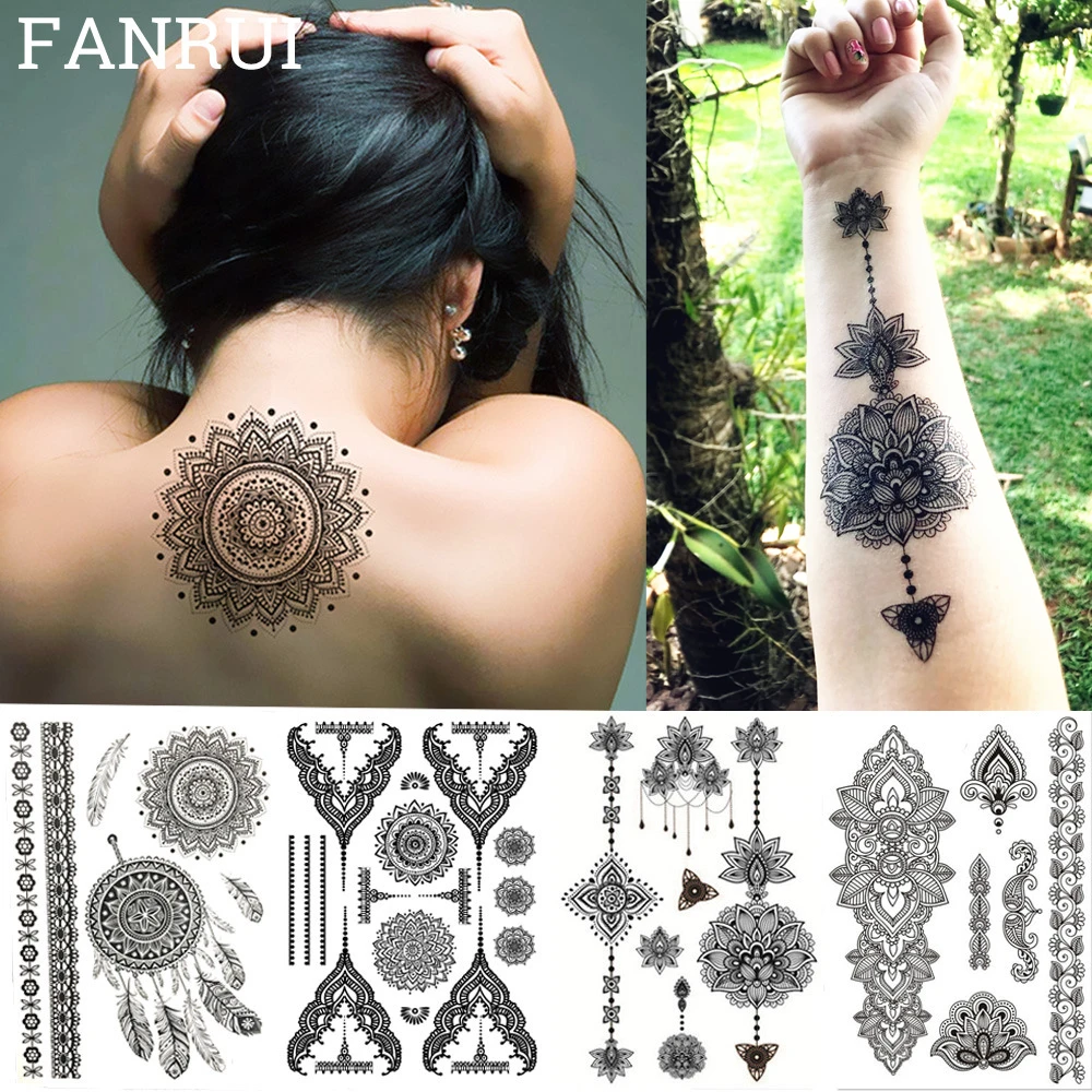 Кружевная черная хна, временная тату-наклейка, Сова, мандала, водонепроницаемая искусственная тату, боди-арт для женщин, 20x12, 5 см, браслет, нарисованный мехенди тату-паста