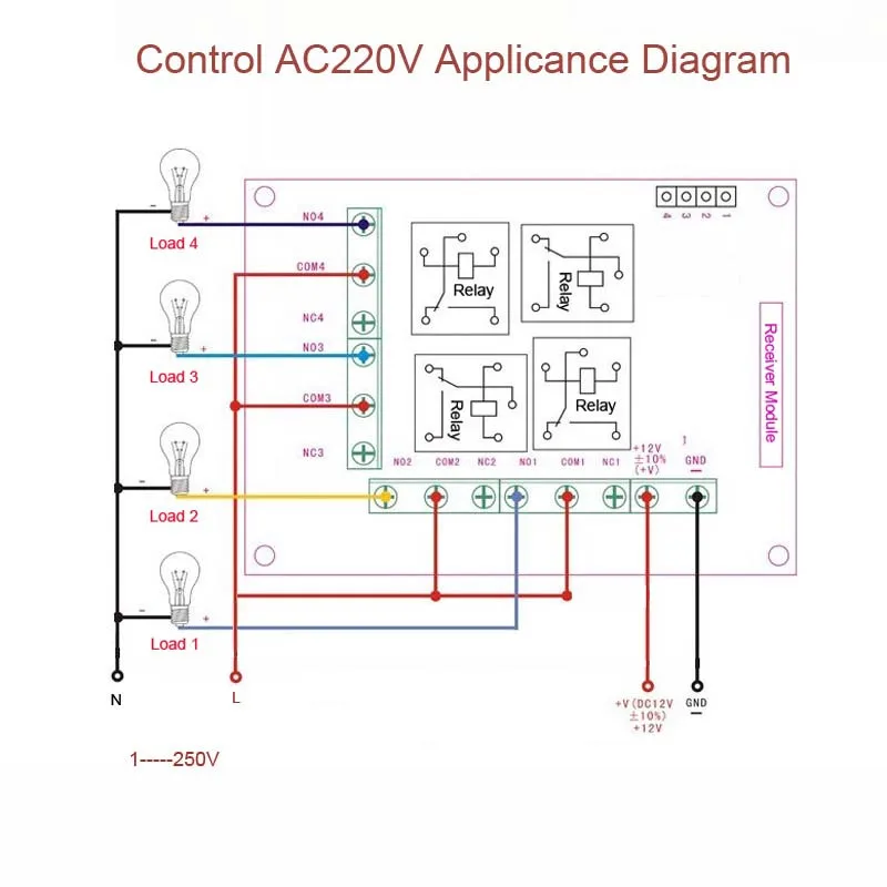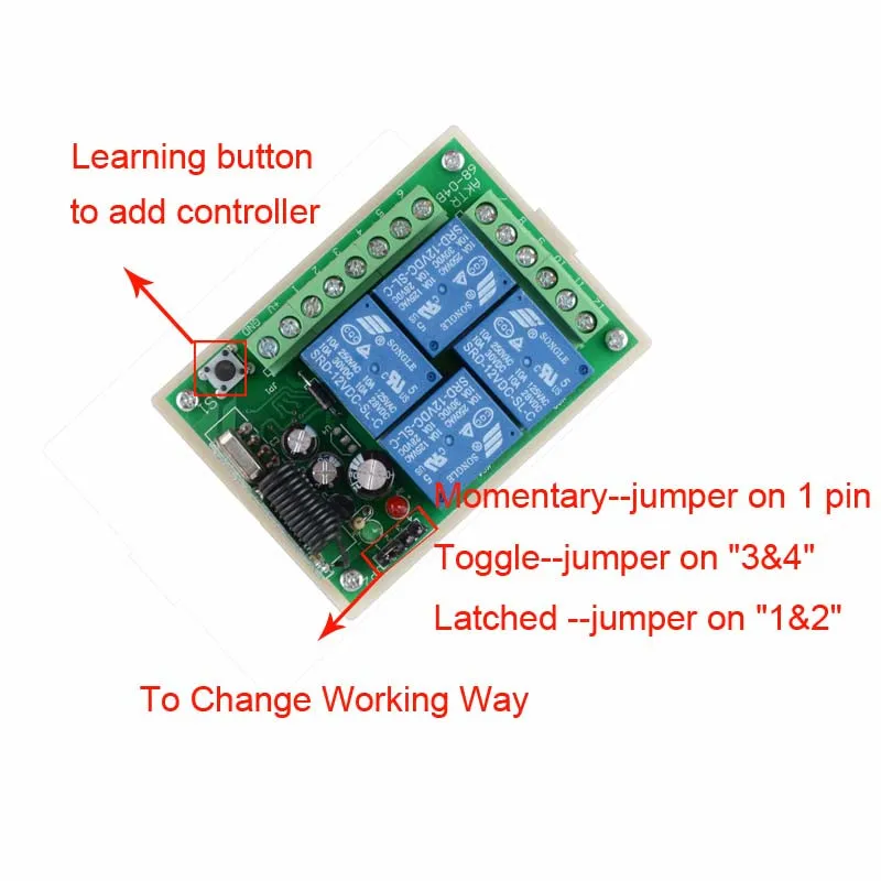 1. Рабочее напряжение: DC12V ± 10%2. Ток: в режиме ожидания менее 10 мА, работает менее 128 мА3. Рабочая температура: -10'C-+ 60'C4. Частота приемника: 315 МГц/433,92 МГц5. Чувствительность приема:-105дБ6. Выходное состояние: значение для переключения7. Максимальная нагрузка: реле 10А, резистивная нагрузка менее 8А, Индуктивная нагрузка менее 3а8. Размер платы приемника: 70*50*18 мм9. Чехол Размеры: 75*55*30 ммТип кодирования: код обученияДобавить передатчик с помощью кнопки обучения на приемнике Выход государство: корректируется с перемычкой на приемника, Мгновенный----- Перемычка на 1 булавке или снимите перемычку Тумблер------- Джемпер на "3 и 4" Фиксатор------ Джемпер на "1 и 2" Мгновенный----- Нажмите кнопку передатчика A, реле приемника A Включено; Кнопка отпустите A, реле приемника A выключено, то же, что и B/C/D Тумблер------- Нажмите кнопку передатчика A 1 раз, реле приемника A Включено; Нажмите кнопку A снова, реле приемника A выключено, то же, что и B/C/D Защелкивается ------ Нажмите кнопку передатчика A, реле приемника A Включено, реле B/C/D выключеноНажмите кнопку передатчика B, реле приемника B включено, реле A/C/D выключеноНажмите кнопку передатчика C, реле приемника C включено, реле A/B/D выключеноНажмите кнопку передатчика D, реле приемника D включено, реле A/B/C выключено Это означает, что блокировка может держать 1CH на, и он будет иметь 1CH на Методы обучения: Вход питания DC12V для приемника, нажмите кнопку обучения, зеленый светодиодный индикатор выключен, затем нажмите передатчик, светодиодный индикатор быстро мигает, это означает, что обучение успешно. Очистка кода: Удерживайте кнопку обучения 8 секунд, пока светодиодный индикатор не включится, это означает, что код был успешно очищен.Посылка включает в себя: