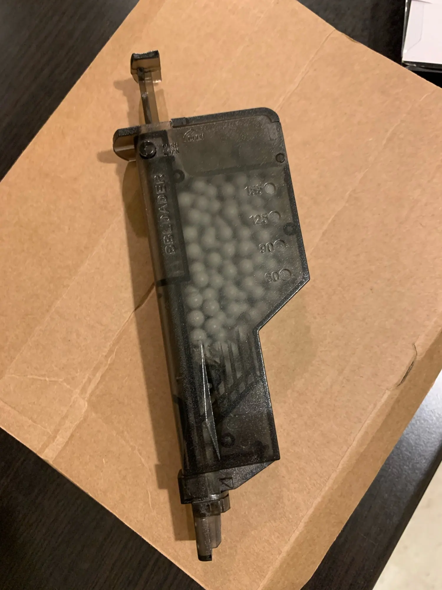 И так, что сказать, о товаре радует только его доставка, если честно. В Украину оно приехало за 13 дней и на этом все плюсы заканчиваются. Качество, искренне, плохое. Впрочем, какая цена, такое качество. Самый дешёвый пластик, швы кривые, неровно склеены половинки, выходное отверстие для шара так вообще под наклоном. Я заказывала две штуки и обе обладают одинаковыми болячками. Смиритесь, последний шарик сто процентов останется в пустом лоадере, руками вы его оттуда не вытащите. Один лоадер даже не входит в шахту магазина, он туда тупо не влазит. На вместительность не проверяла. В принципе оно работает, но долго ли проработает - хрен его знает. Если честно, товаром разочарована