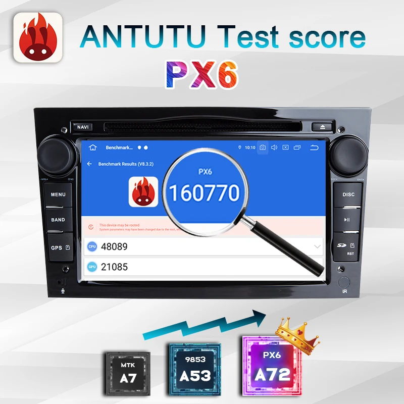 PX6PX6 является лучшим чипом на рынке в настоящее время, он работает быстрее, чем все другие типы. Балл ANTUTU составляет 160770, что лучше 7853 4G + 64G, PX5 и всех других типов 4 + 64G на рынке. По сравнению с другими радио типа fo, PX6 radio может загружать больше видов приложений android с android market, и приложение может работать лучше.