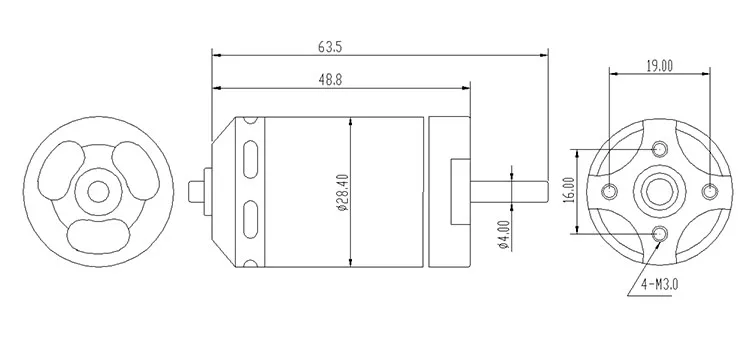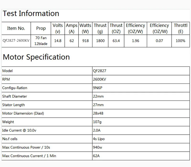 Модель: QF2827 об/мин: 2600KV Configu-ration:9N6P Диаметр статора: 22 мм Длина статора: 27 мм Вес: 107 г Ток холостого хода @ 10 В: 2.0A No.f ячейки: 4S lipo Максимальная непрерывная мощность/10S: 1000 Вт Максимальный непрерывный ток/1 мин: 62A Опора: 70 мм вентилятор 12 лопастей упорная (г):1800 г