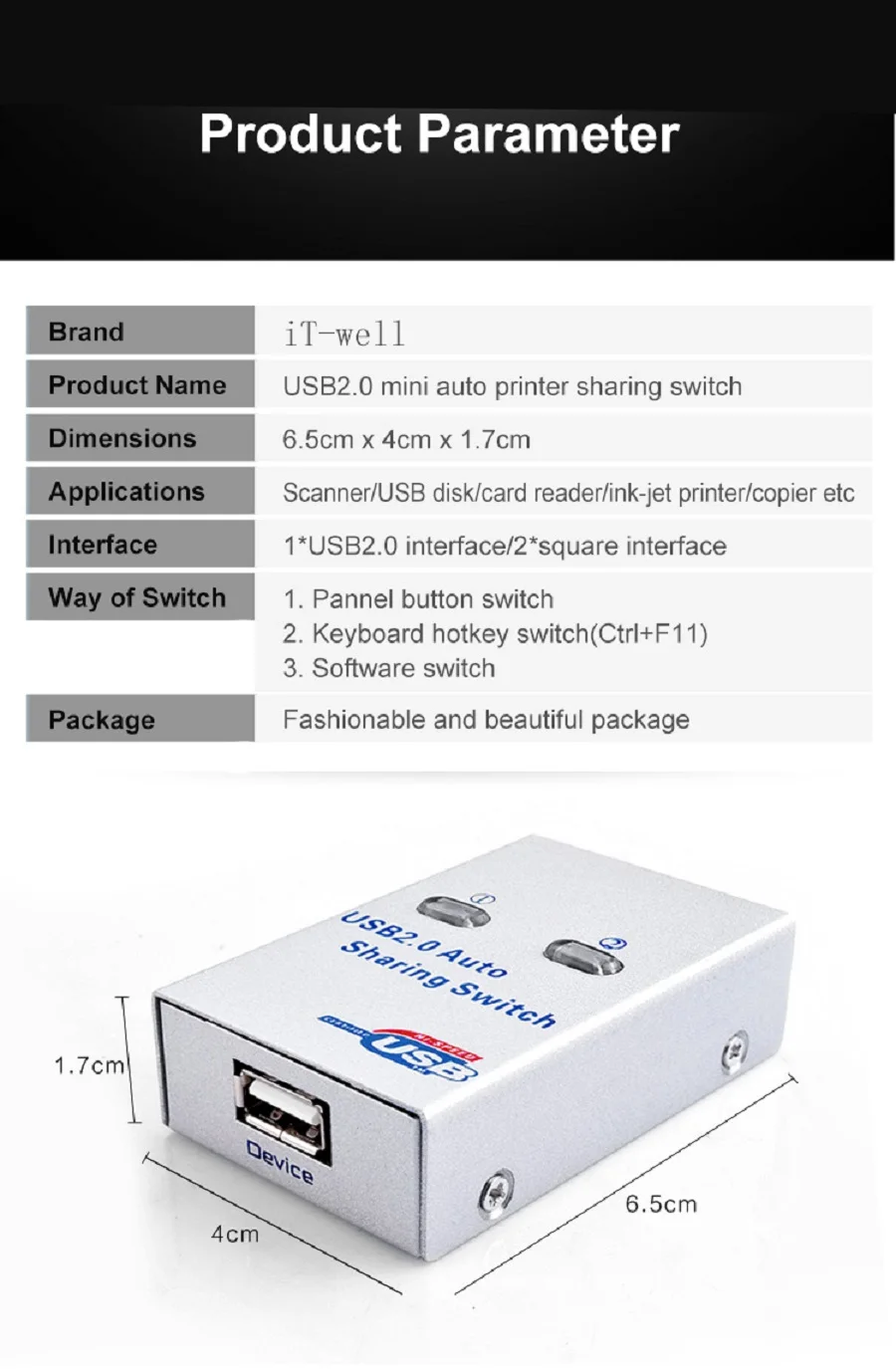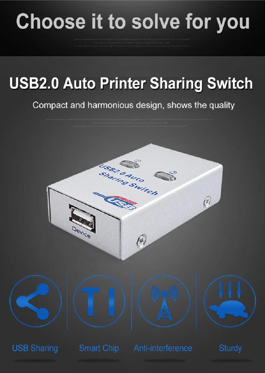 Переключатель USB 2 в 1, автоматический переключатель обмена для 2 принтера для совместного использования компьютера, поддерживает 2 компьютера для совместного использования 1 usb-устройства