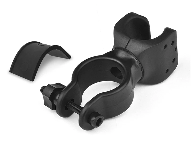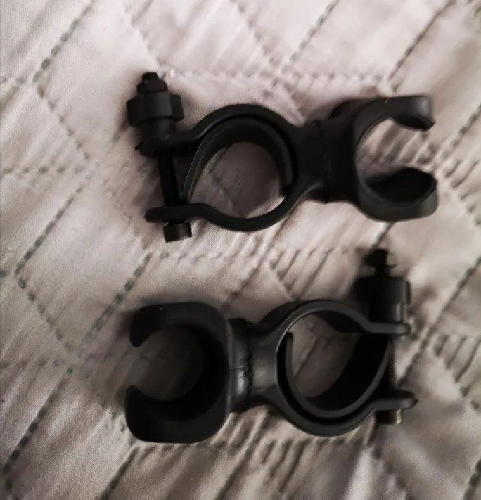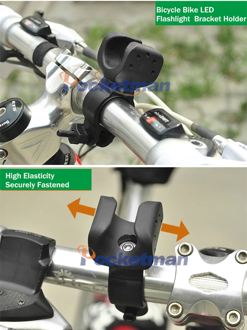 Держатель фонарика для велосипеда Держатель: Материал изделия: высокопрочный Упругий Пластик Цвета: черный Размер подходит для фонарика: 2,2-2,9 см/0,9-дюйма (диаметр) Размер, подходящий для велосипеда (Диаметр руля велосипеда): 2,5-3,5 см/1-дюйма (диаметр)