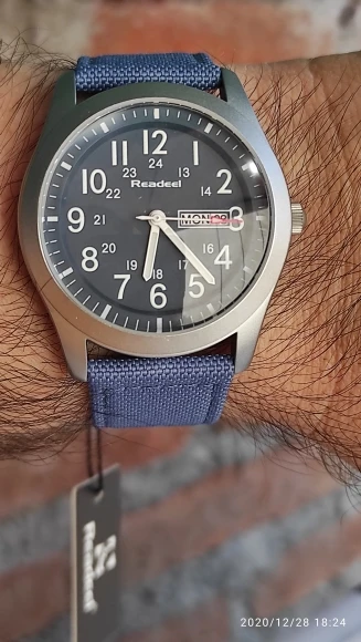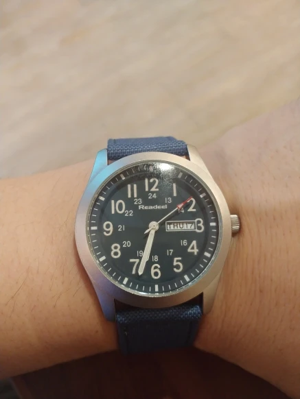 Красивые часы, особенно потому, что кроме отображения даты, также есть дневные стенды. Браслет хорошо обработан. Сочетание кожи и ткани. Цифры и руки очень хорошо читаются. Когда много часов контрастирует, а именно, очень плохо. Мне также не нравится, когда кто-то из этой идеи наносит черный указатель на черный фон. Но, как и с этой белой указкой часов и цифрами на синем фоне, супер чтение. Я буду покупать часы в любое время.
