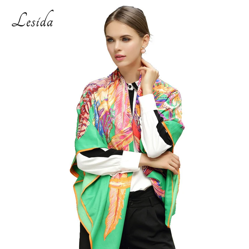 Lesida 100% шелковый шарф Для женщин большие платки Перо печати палантины Площади Бандана Элитный бренд платок, шарф женский платок 1306