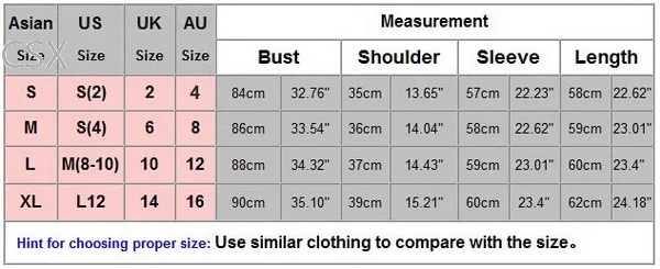 Размер:Есть Четыре размера (S, M, L, XL) Несколько размеров доступно для следующих товаров. Пожалуйста, учитывайте разницу в 1-2 см из-за ручного измерения, спасибо (все измерения указаны в см, обратите внимание, что 1 см = 0,39 дюйма)