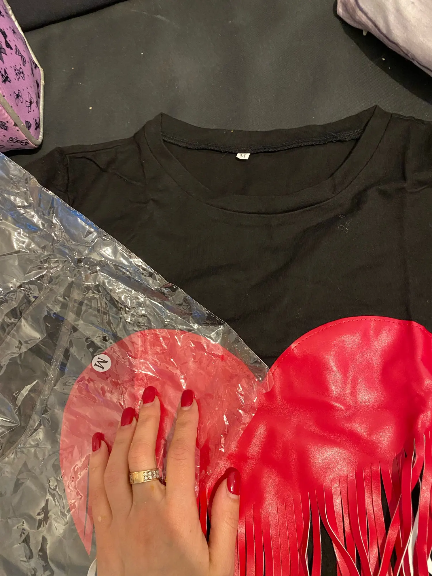 Футболка шикарная, как и на картинке. Совет, если не хотите чтобы сердечко из эко кожи при стирке испортилось, стрирайте не выше 20-30 градусов.