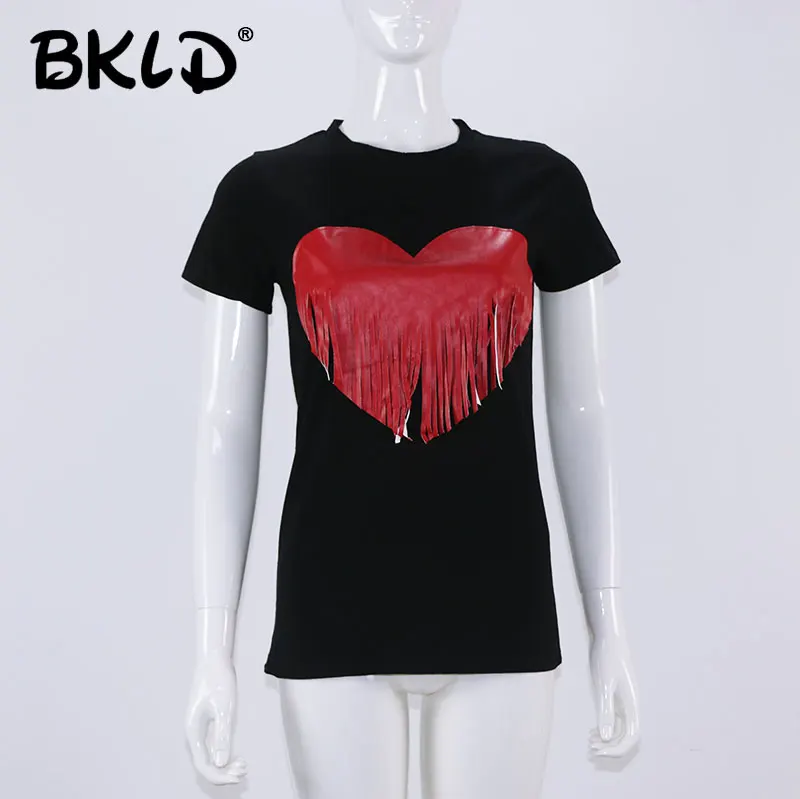 BKLD модные летние топы для девочек с принтом сердца, футболки с бахромой, женские футболки с коротким рукавом, женские студенческие футболки для подростков
