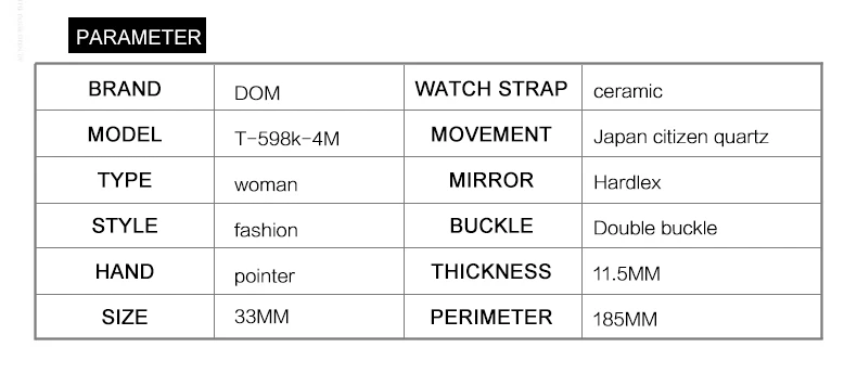 Бренд: DOM-Дисплей: аналоговые кварцевые часы-Стиль: Модный, Повседневный, роскошный,-Особенности: Водонепроницаемость, ударопрочность, плавание,Основная особенность:-100% новый с биркой и высоким качеством;-3 АТМ/200 м Водонепроницаемость (поддержка холодного душа и плавания, не использовать часы под водой, не поддерживать горячую воду);-Качественный керамический чехол;-Качественный керамический ремешок;Спецификация приближения:-Чехол Диаметр: 3,3 см-Чехол Толщина: 1,15 см-Диапазон Ширина: 1,4 см-Общая Длина: 18,5 смПосылка включает в себя:-Часы DOM-1 шт.-1 x DOM BoxDOM брендовые модные часы женские роскошные керамические наручные часы ЖЕНСКИЕ НАРЯДНЫЕ Часы повседневные керамические часы Relogio Feminino T-598K