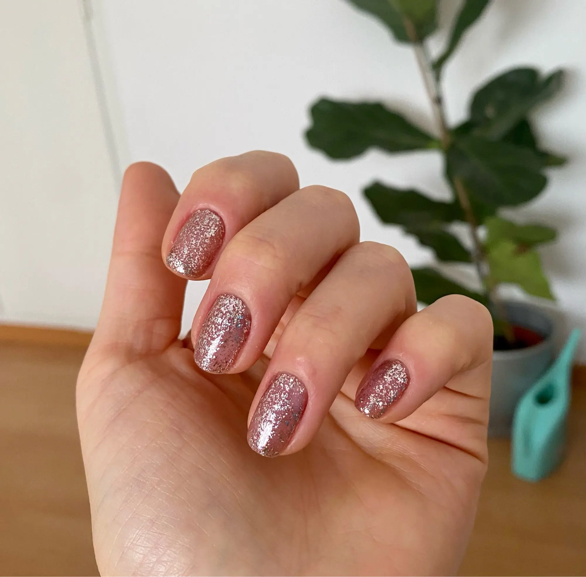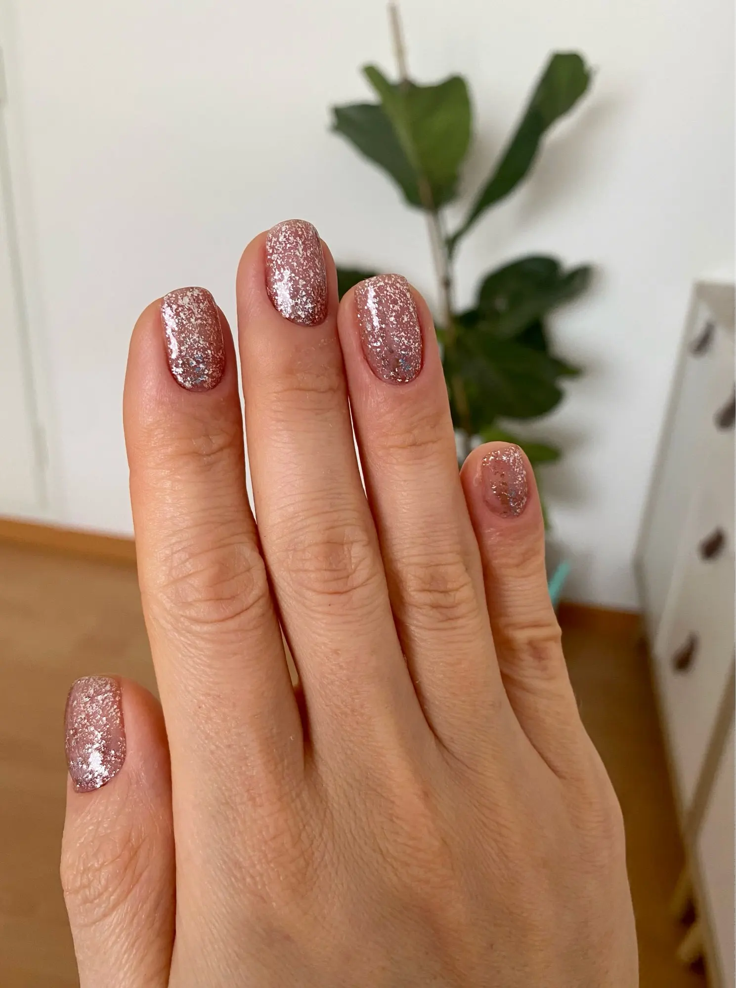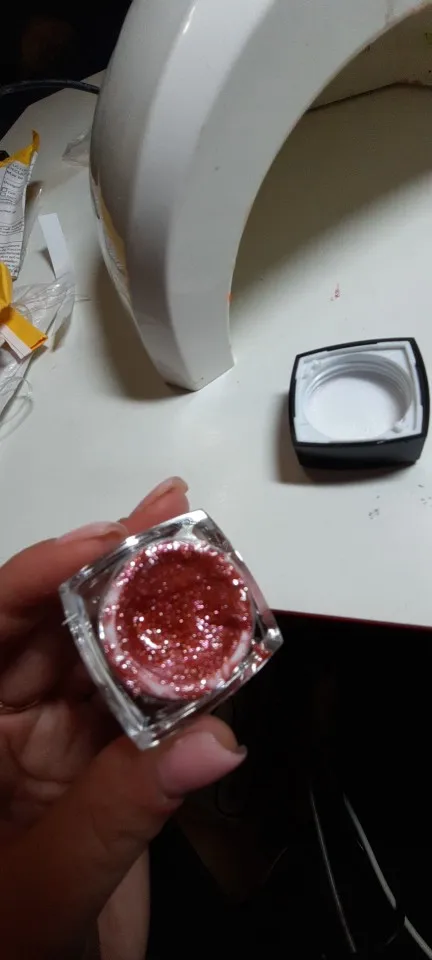 Гель просто отличный. Не течёт. Распределяется очень быстро и без затёков. Подложка телесно-розовая и этот оттенок делает пальчики нежными. Блестки оттенка металика с едва заметным розовым подтоном. Блестки распределяются хорошо, не собираются в одну кучу за кисточкой.