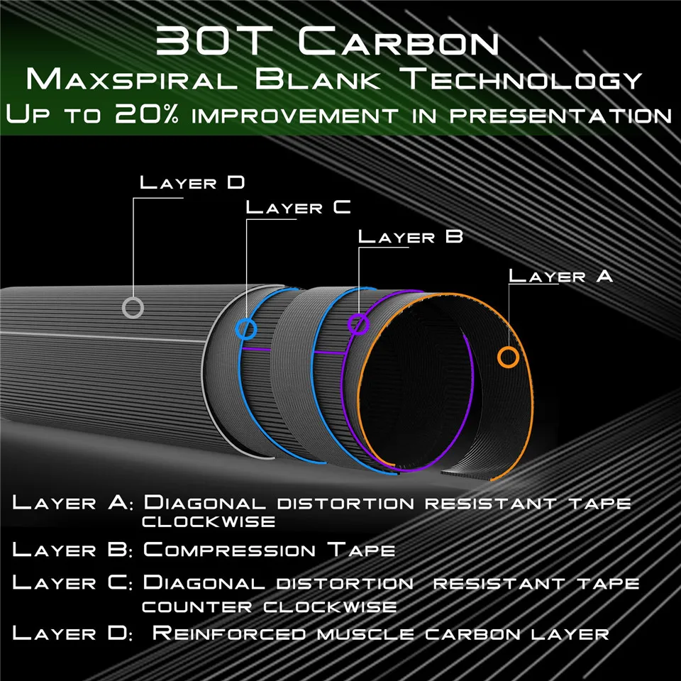 • Эксклюзивная технология MAXSPIRAL BLANK-средняя скорость действия стержень пустой изготовлен из IM8 графита и полного гибкого профиля стержня для деликатного представления летучей мыши, защита от палантин и точное литье на короткие расстояния