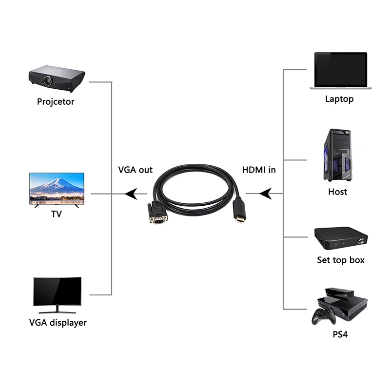 * Встроенный усовершенствованный микросхема IC преобразует цифровой сигнал HDMI в аналоговый сигнал VGA; Это не двунаправленный преобразователь и не может передавать сигналы от VGA к HDMI