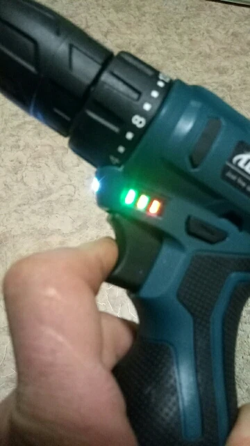 Пришел заряженный. Из минусов не всегда фиксируется в крайнем положении переключение скорости и нет фиксации в режиме сверления!