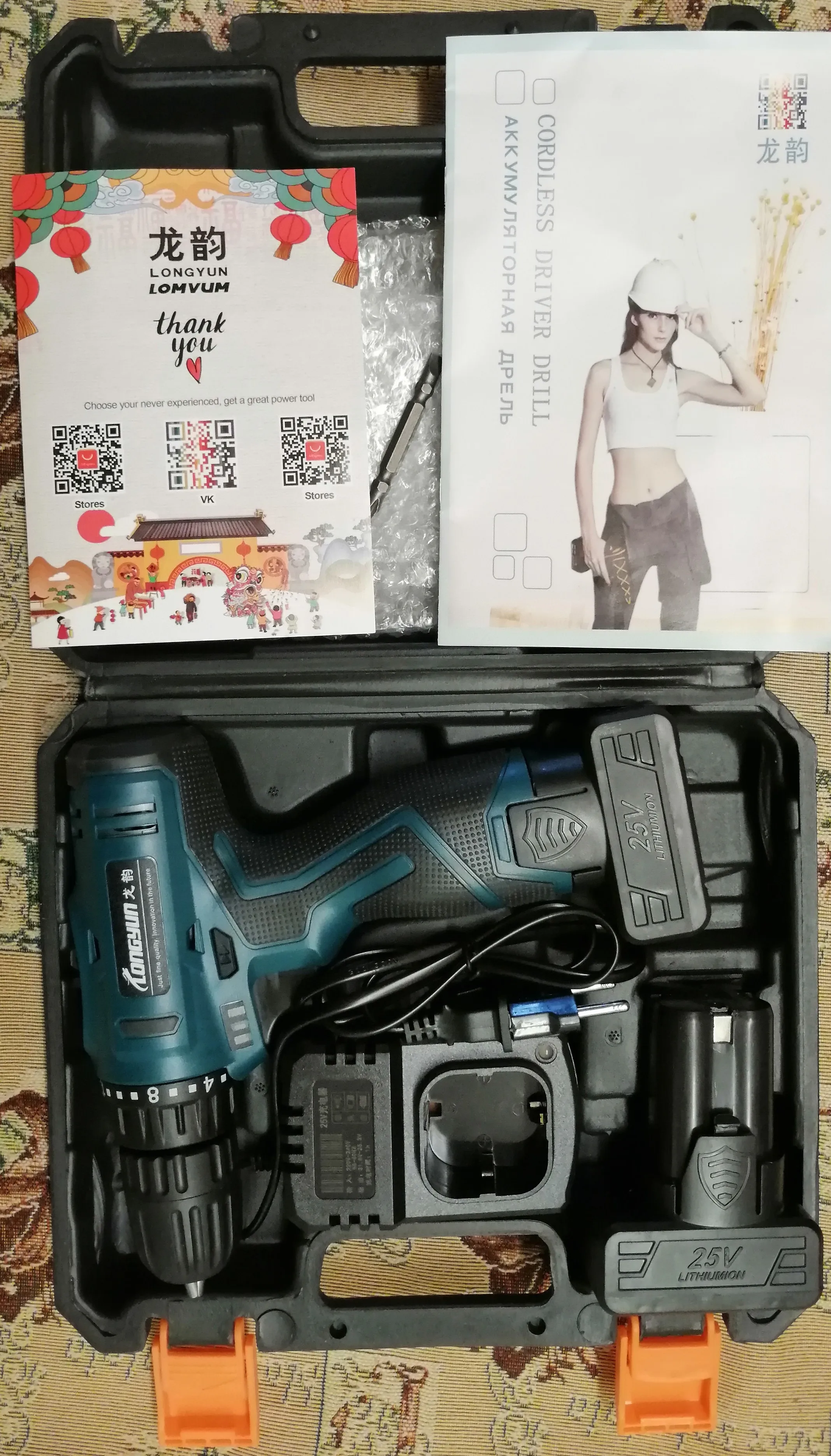 Шурик пришел за две недели. Посылка картонная, чуть потертая. Кейс компактный и прочный, внутри него все целое, батареи заряжены. На вид все качественно, пластик не воняет (запах есть, но только если уткнутся носом, но это обычный запах). Юзал Шурика ~день, это мой первый Шурик. Докопаться можно до 2 мелочей: 1- люфт шпинделя, который можно увидеть при приложении радиальной нагрузки на остановленное сверло (~0,2 мм при длине сверла ~40 мм от патрона). При вращении рад. биения не видно, так что на качество разделки отв. данный люфт никак не повлияет, тем более ручной разделки (рука человека гуляет гораздо больше); 2- нет "защиты от дурака", т.е. ползунок переключения можно остановить посередине, что как написано в инструкции может привести к поломке. На сколько Шурик надежен и долговечен покажет время, а так впечатление "от первого свидания", что это качественный, компактный для своей мощности, удобный и сильный "зверек". Разработчику, Изготовителю, Продавцу и дядюшке Али спасибо!