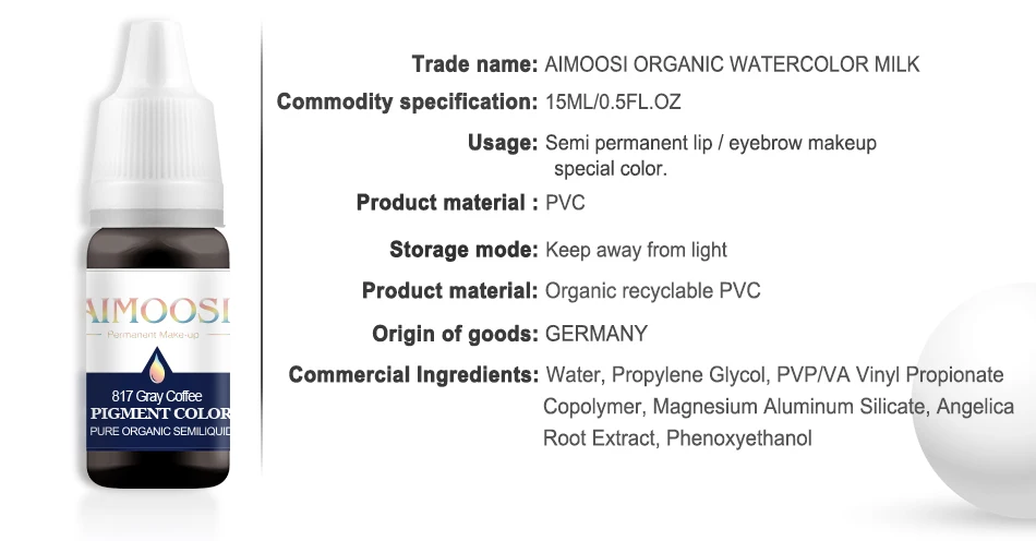 Вы можете подключиться к пигменту Aimoosi по пяти причинам1.100% новый и высокое качество2. Все пигменты не являются слоем и не выцветают.3. Один грамм пигмента полностью s oluble в воде, показывая цвет очень быстро.4. Кожа легко впитывает пигмент, не выцветает после ремонта.5. Все пигменты стерилизованы (гамма-лучами)