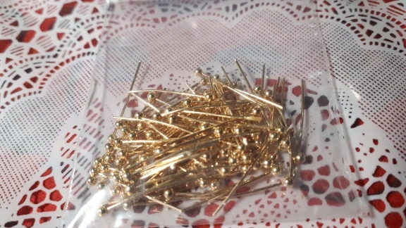 Пины отличные! В меру упругие, по диаметру тоже самое то для бусин и шапочек с широким отверстием. Цвет точный. Шарики ровные. На пинах никаких потертостей.